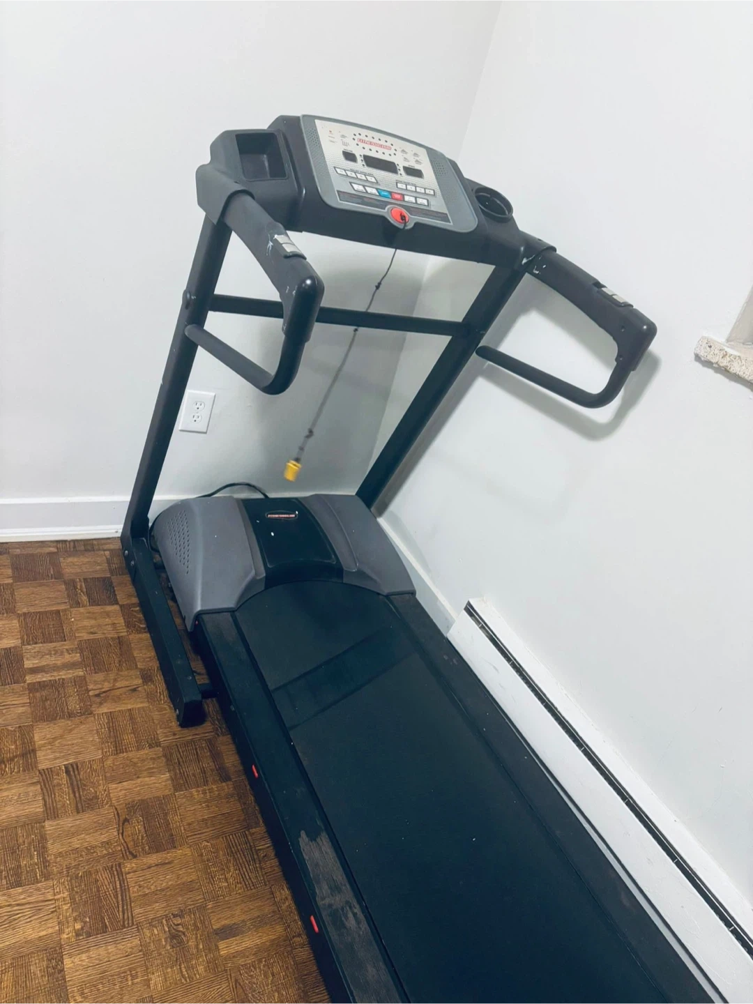 Fitness Club brand treadmill for sale. It has incline and speed controls, with quick keys for adjustment. Includes a safety key and cup holder.