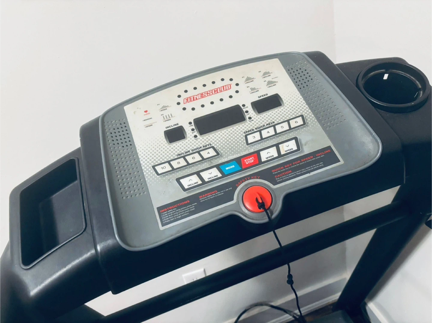 Fitness Club brand treadmill for sale. It has incline and speed controls, with quick keys for adjustment. Includes a safety key and cup holder.