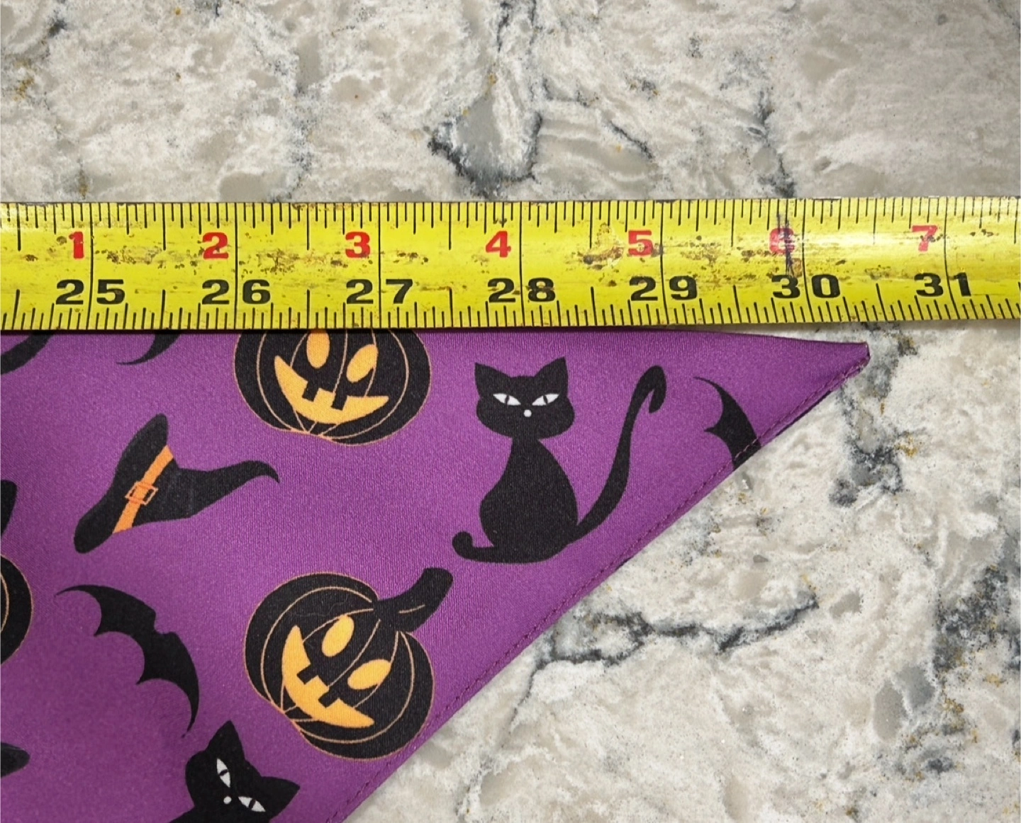 It's purple with a fun pattern of black cats, pumpkins, bats, and witch hats.