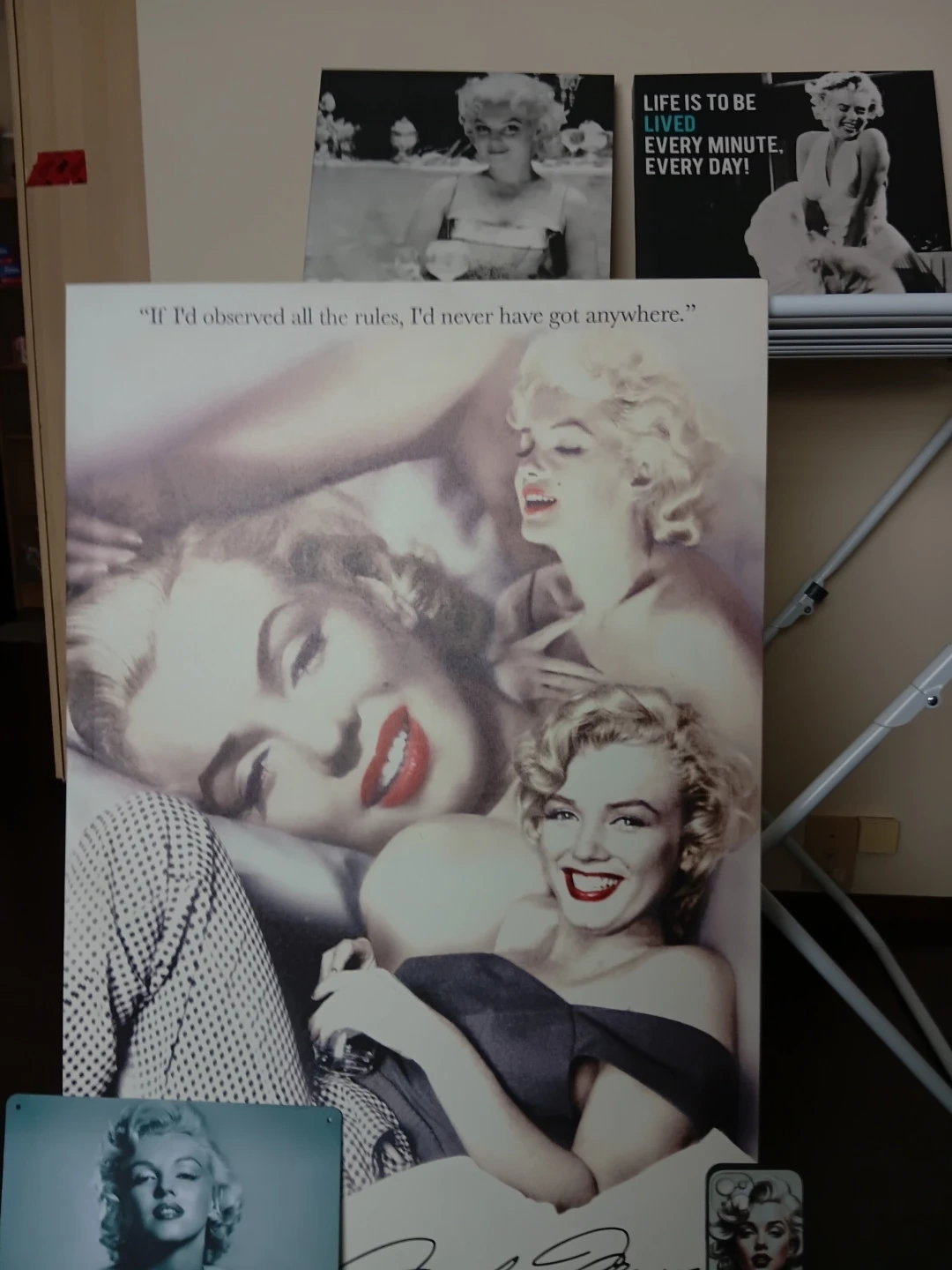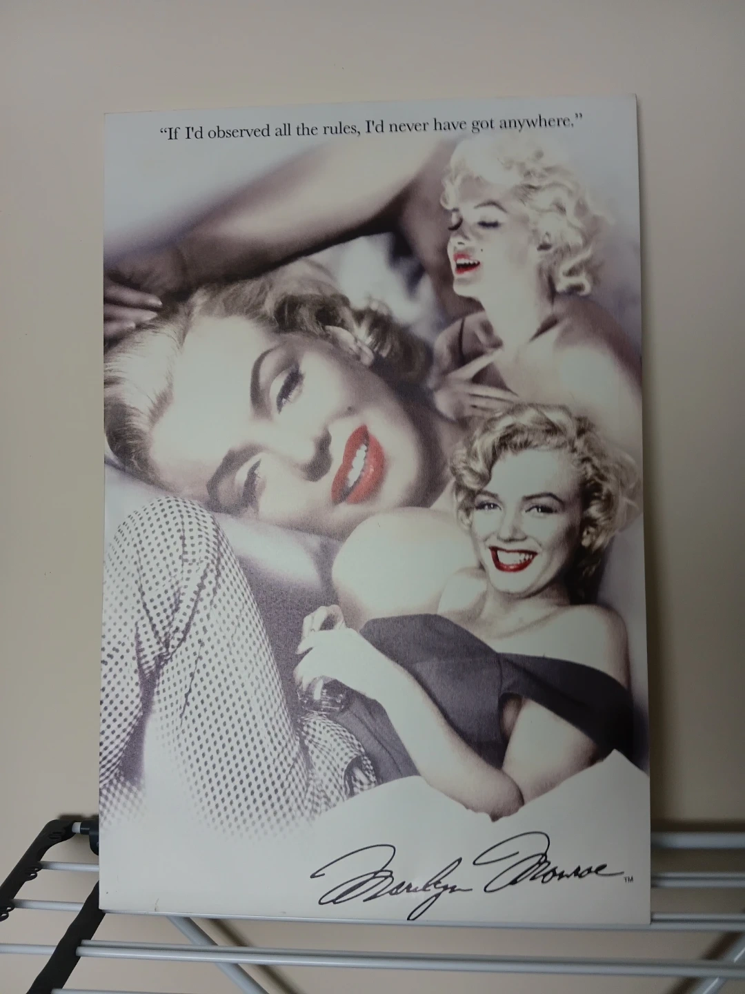 Collection of Marilyn Monroe prints and a small photo. Features iconic images and quotes. Great for fans of classic Hollywood!