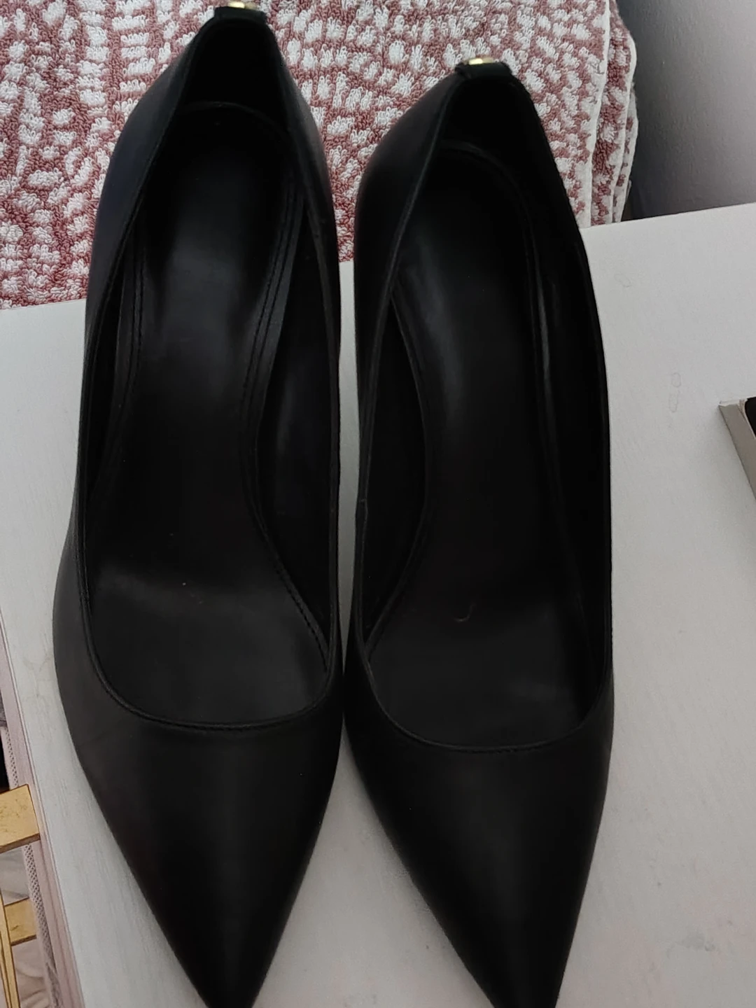 Classic black leather pumps from Michael Kors. Features a stylish pointed toe and a comfortable heel height. These shoes are made from genuine leather and have the MK logo detail on the heel.