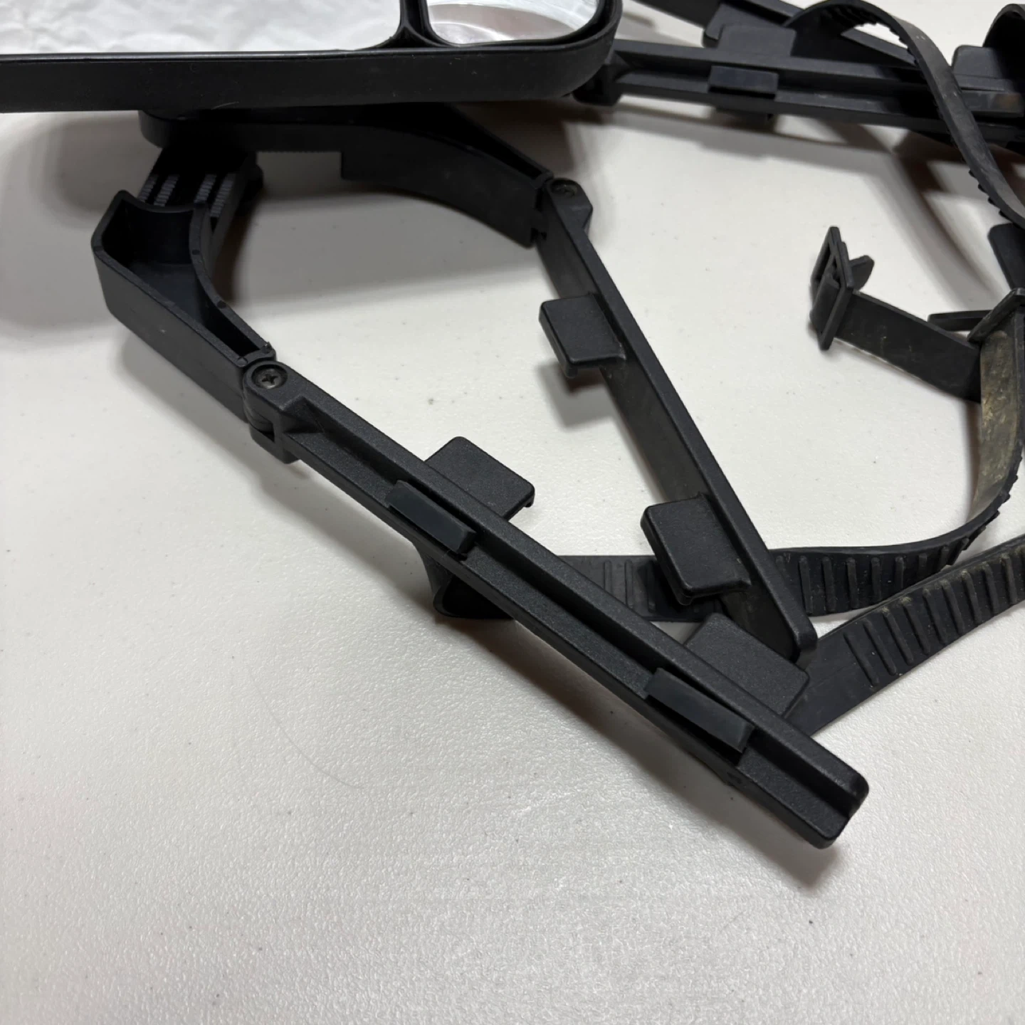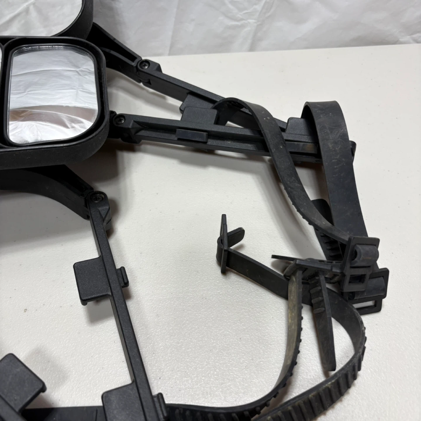 These are towing mirrors designed for vehicles. They are black with adjustable straps for mounting. The dual mirror design provides a wider view.