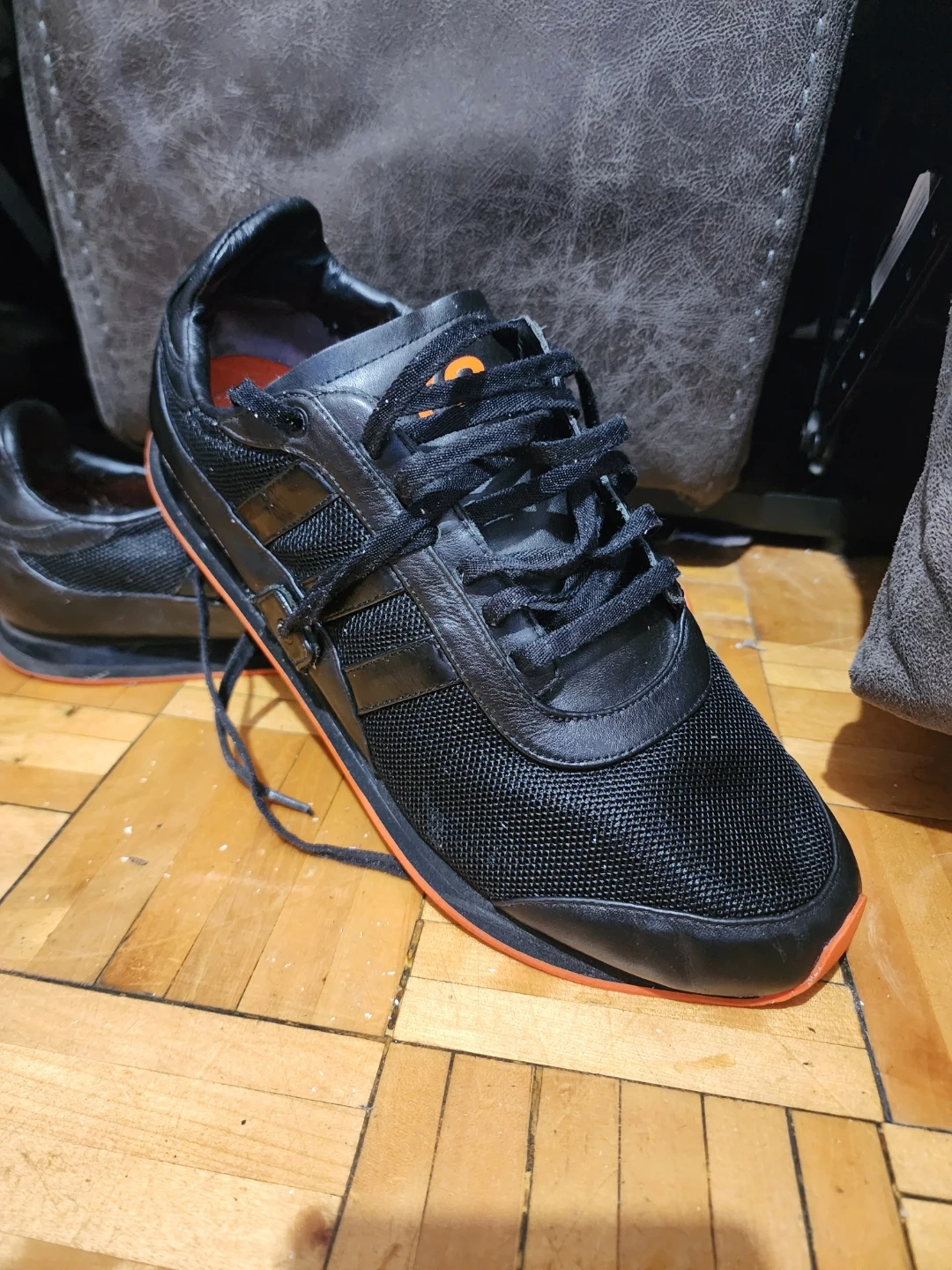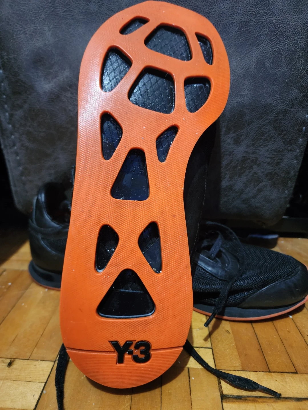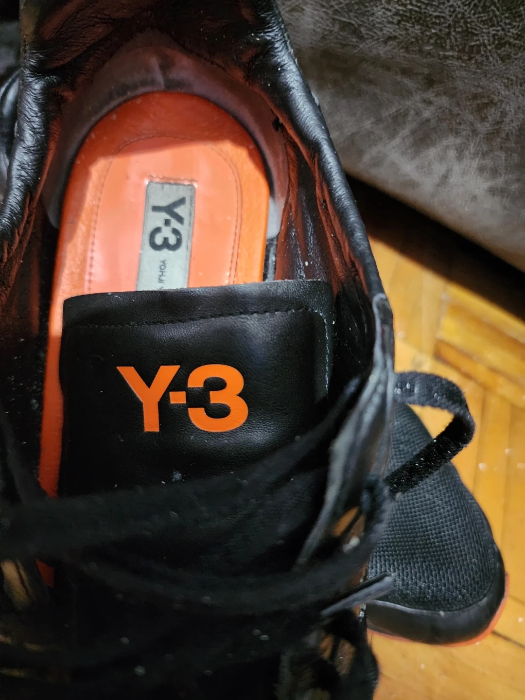 Baskets noires Y-3 Yohji Yamamoto pour hommes. Cuir et textile. Semelle orange. Lacets noirs.