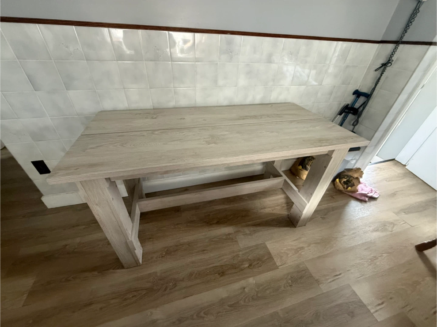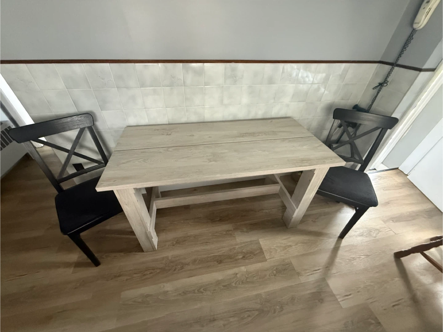 Table and chair is 2 years old. Looks brand new. Measures 55 1/4" L x 25 1/2 W x 30 1/2 H for table and chairs are 35 1/2 H back of chair x 17" W x 17 1/2" H of seat. Pick up Welland.