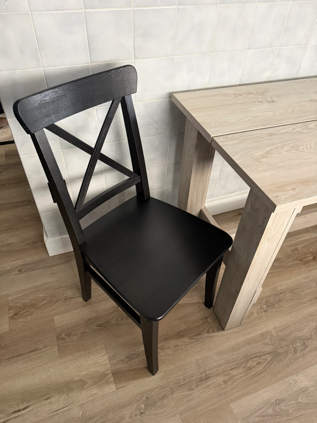This dining set includes a light wood finish table with a rustic design. Two black chairs with X-back detailing are also included. It's perfect for a small kitchen or breakfast nook.