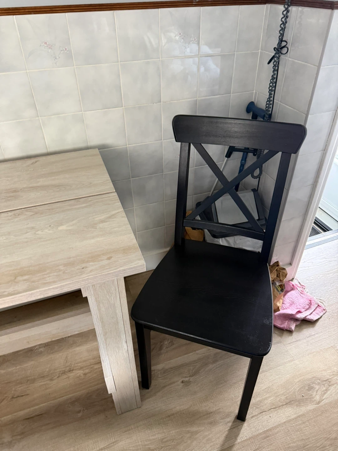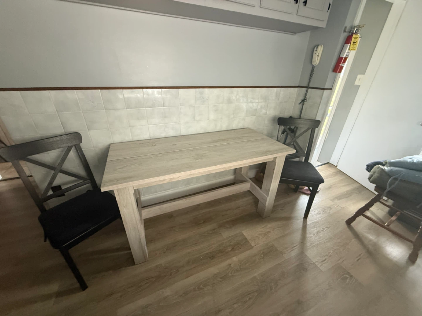 Table and chair is 2 years old. Looks brand new. Measures 55 1/4" L x 25 1/2 W x 30 1/2 H for table and chairs are 35 1/2 H back of chair x 17" W x 17 1/2" H of seat. Pick up Welland.