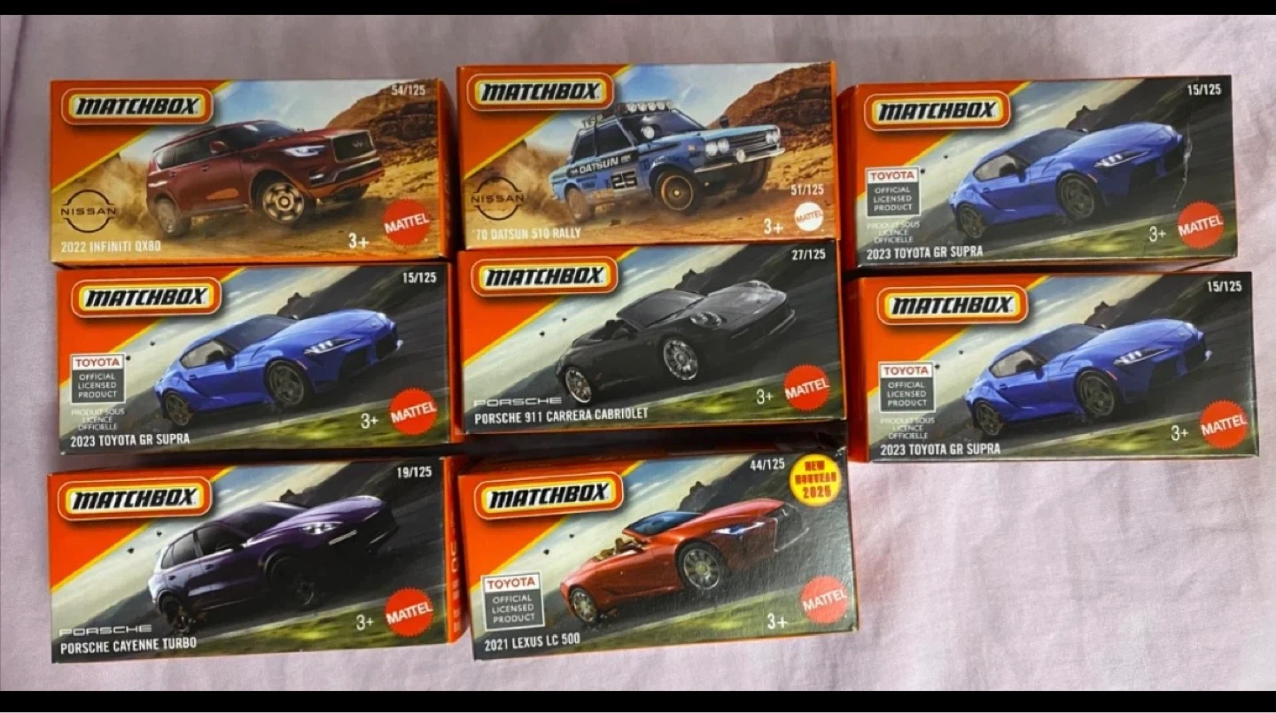 Matchbox die-cast cars including a 2022 Infiniti QX80, '70 Datsun 510 Rally, 2023 Toyota GR Supra, Porsche 911 Carrera Cabriolet, Porsche Cayenne Turbo, and 2021 Lexus LC 500. All are officially licensed products.