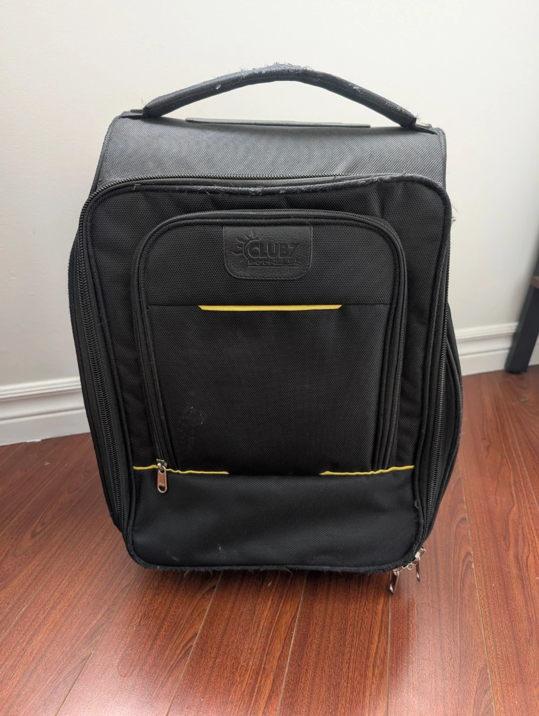 Black suitcase/ cabin luggage with yellow trim. It's a rolling suitcase with a pair of wheels and a retractable handle. Has multiple zippered compartments.