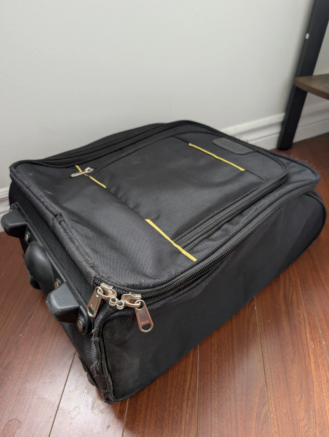 Black suitcase/ cabin luggage with yellow trim. It's a rolling suitcase with a pair of wheels and a retractable handle. Has multiple zippered compartments.