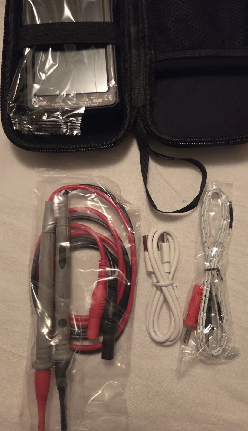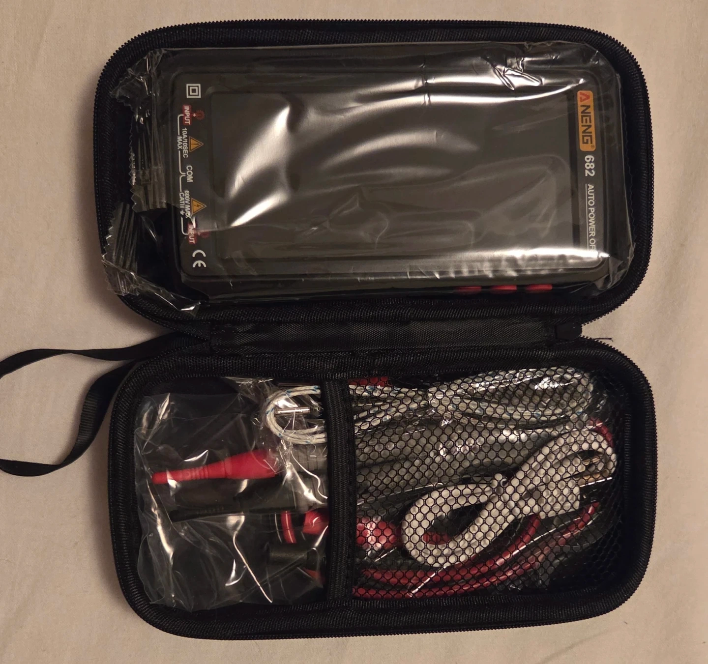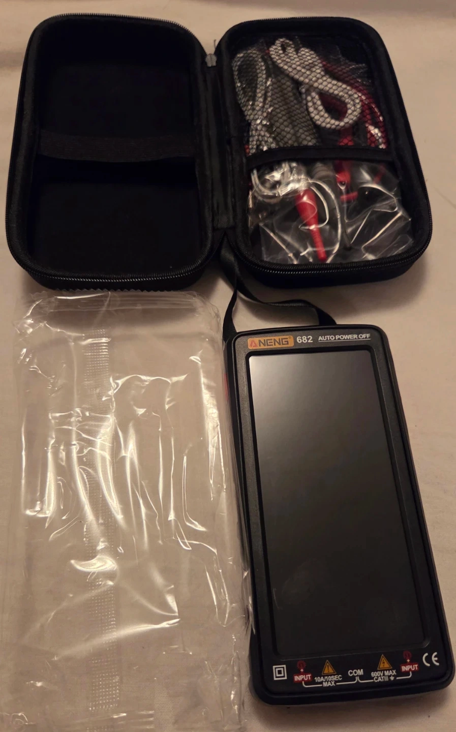 This is an ANENG 682 digital multimeter. It's a compact unit with test leads, a USB charging cable, and a carrying case included. The device features auto power off.