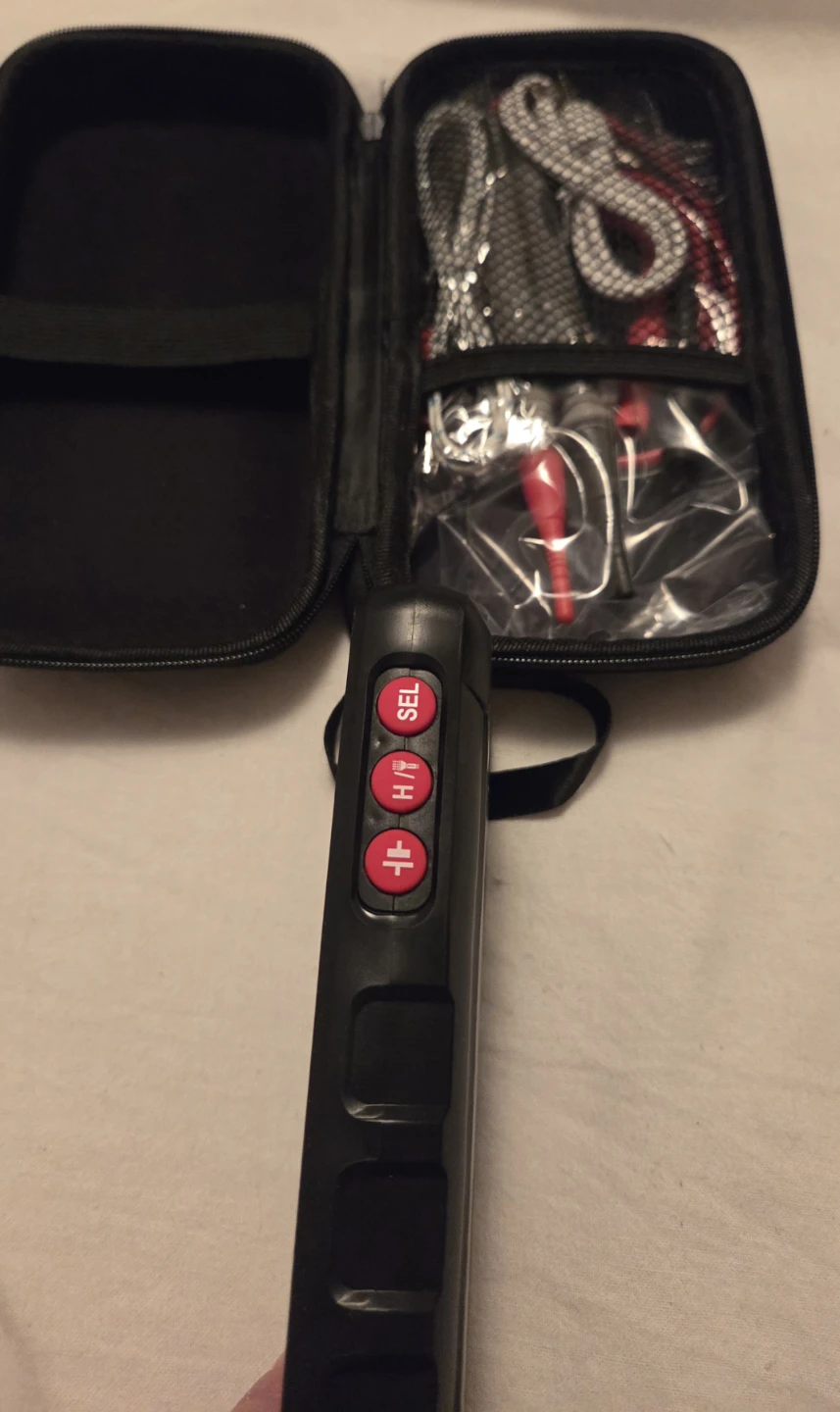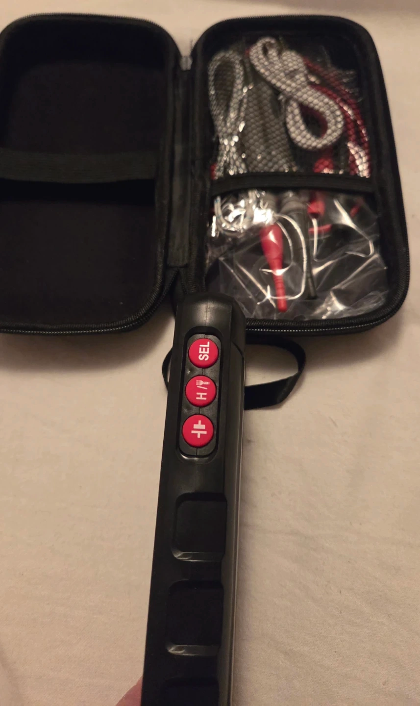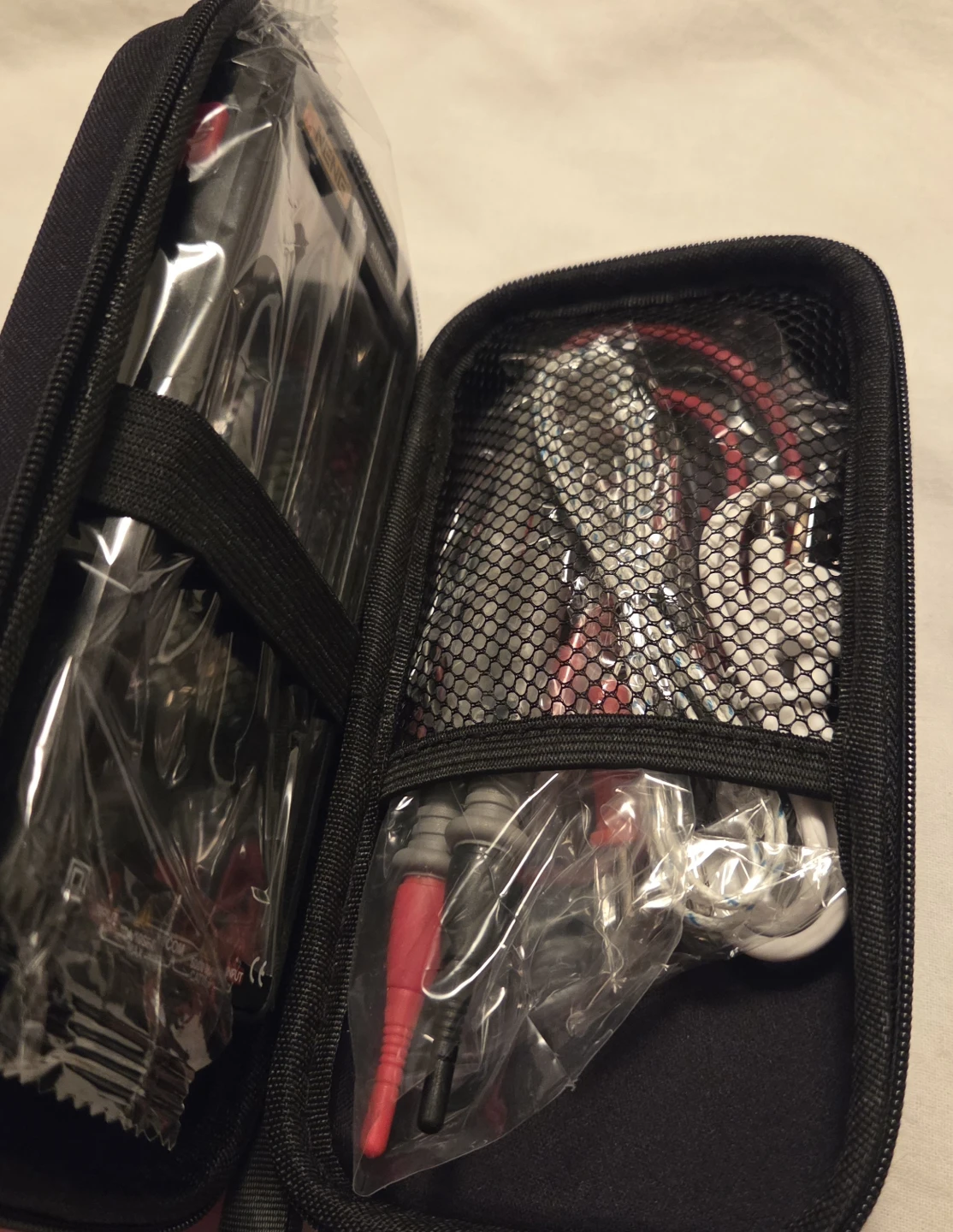This is an ANENG 682 digital multimeter. It's a compact unit with test leads, a USB charging cable, and a carrying case included. The device features auto power off.