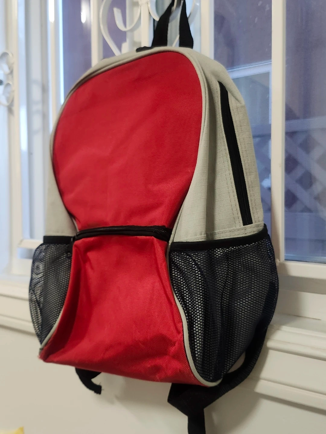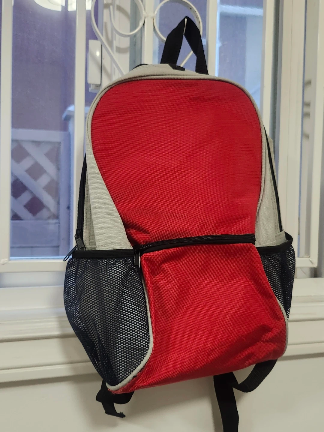 This is a red and grey backpack with a zippered front pocket and mesh side pockets. It's great for carrying everyday essentials! The bag features adjustable shoulder straps for comfort.