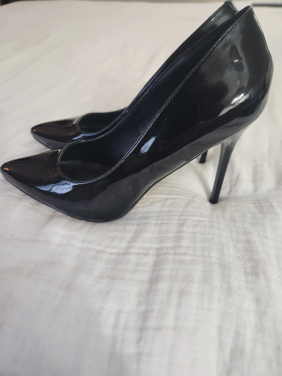 These Madden Girl heels have a shiny black patent finish. They're classic stilettos with a pointed toe and a high heel. Perfect for dressing up any outfit!