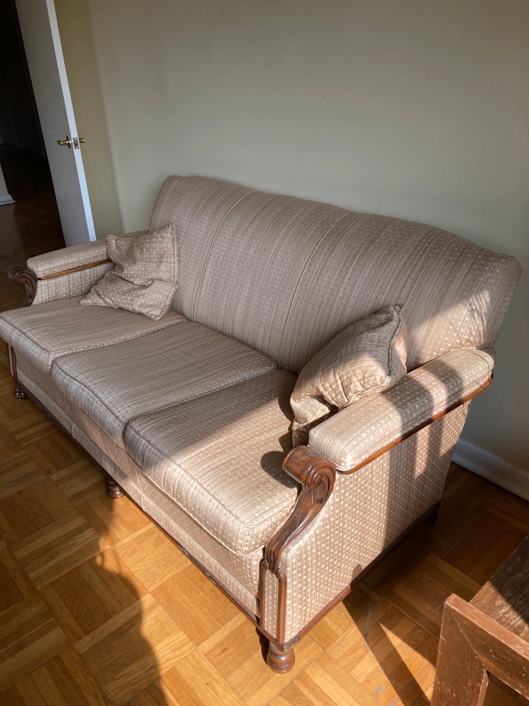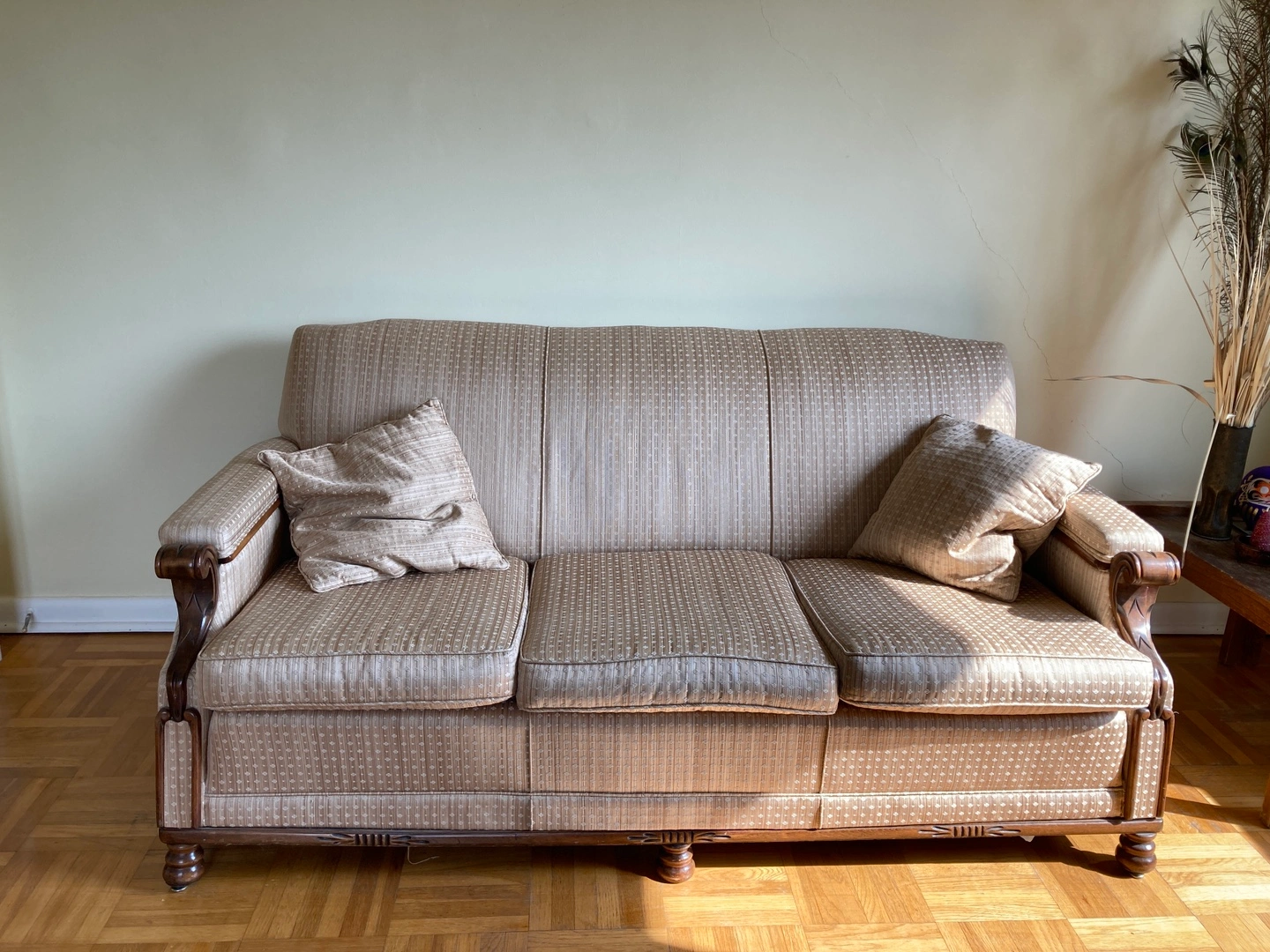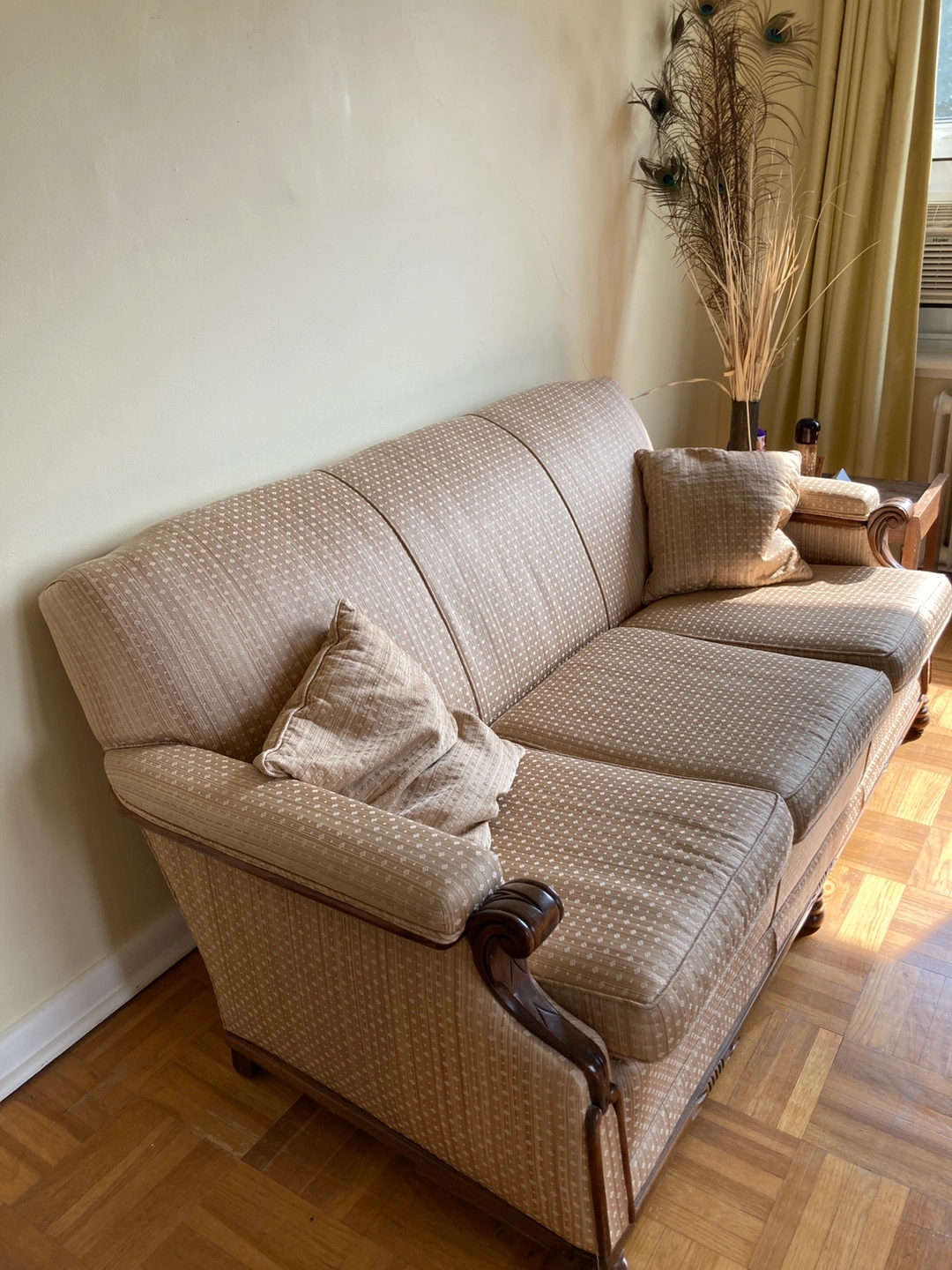FREE! A lovely vintage-style sofa and matching armchair. They have a classic design with patterned upholstery and wooden armrests. Perfect for adding a touch of elegance to your living room or can be used as a stage prop etc. The couch does need some work on the bottom, but in overall in very good condition.