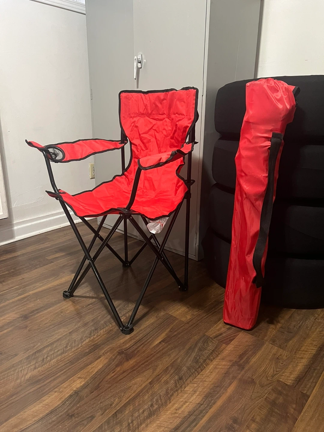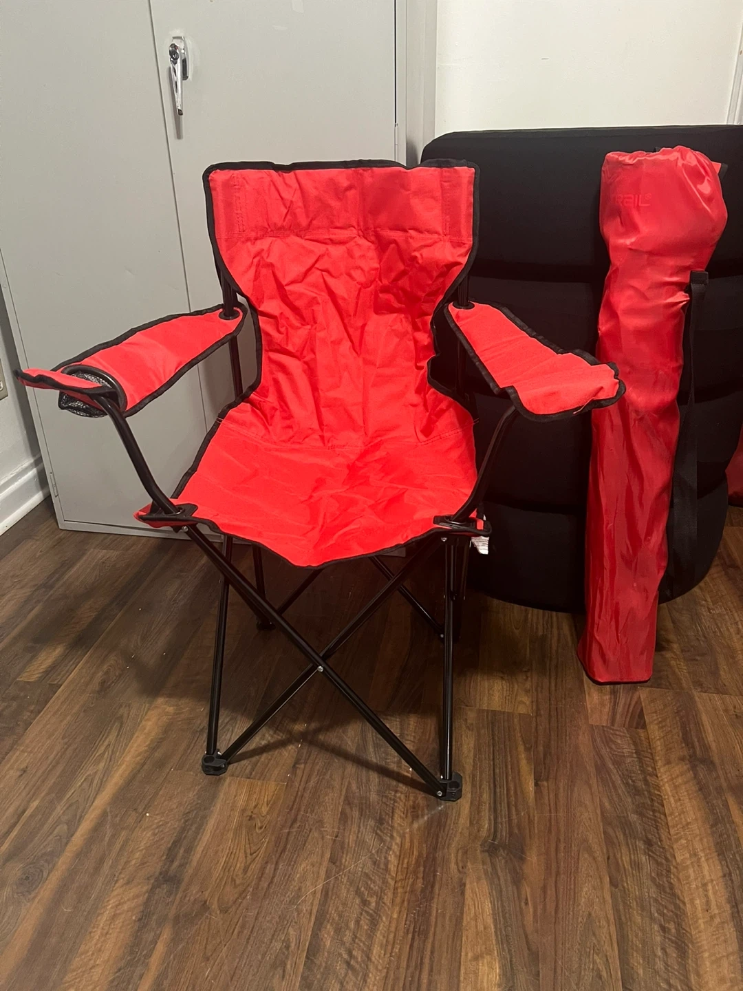 Selling a bright red folding camping chair! It's super convenient for outdoor adventures and comes with its own carry bag for easy transport and storage