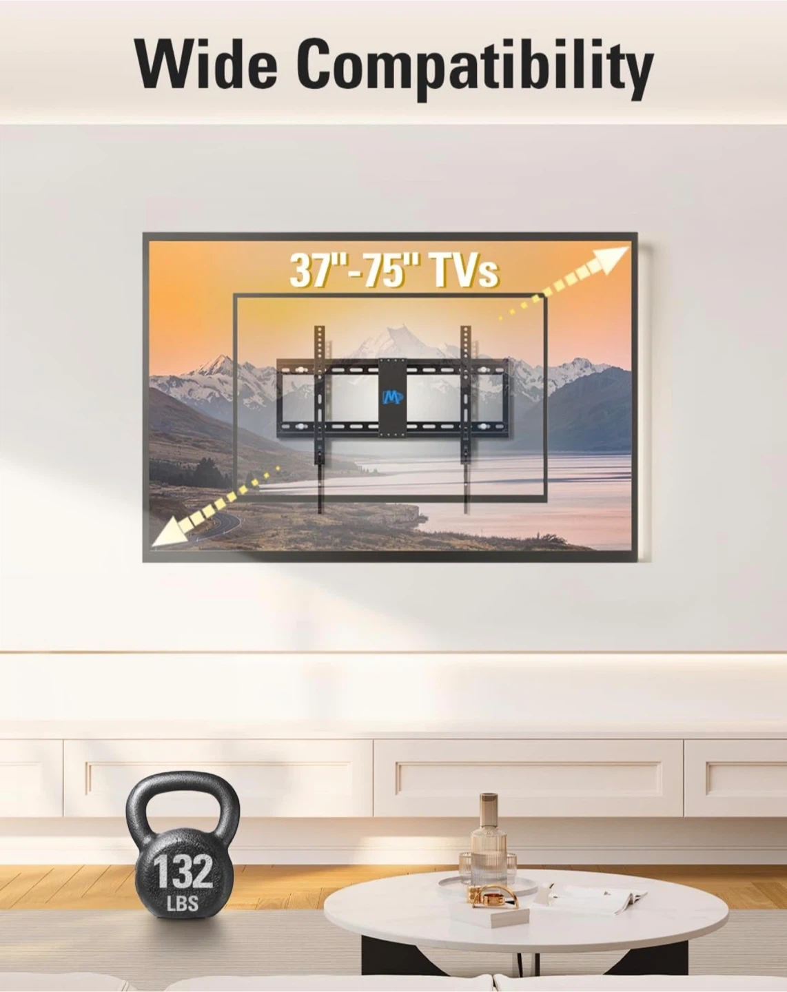 This TV wall mount supports screens from 37" to 75". It offers a tilt function for anti-glare viewing and a double hook design for stability. It's built to hold up to 132 lbs. Includes a level for easy installation.