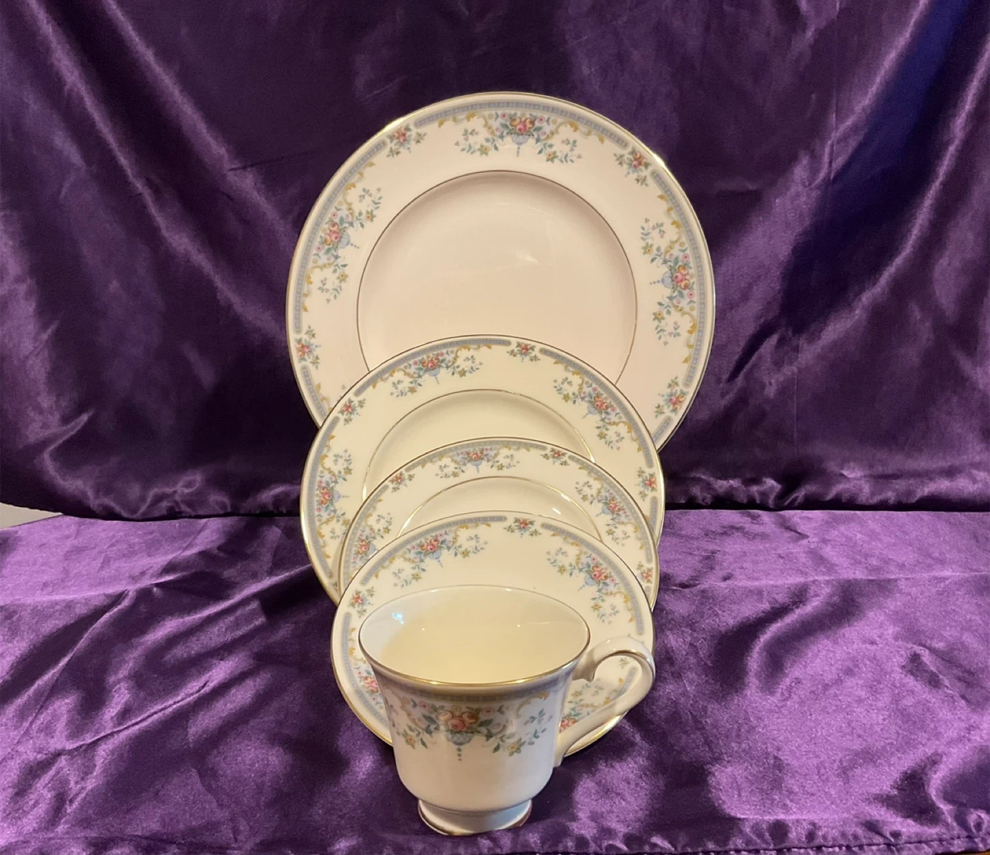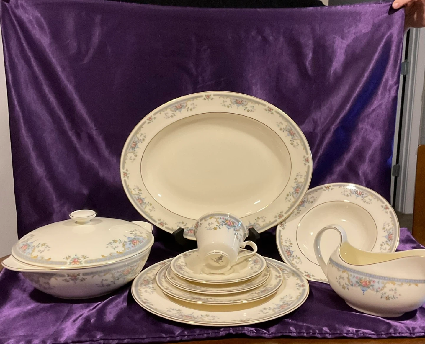 This Royal Doulton, 10 place setting plus gravy boat, platter, covered serving dish, china set features a delicate floral pattern with blue and pink accents and a gold trim. It includes dinner plates, salad plates, bowls, a cup and saucer, a serving platter, a covered casserole dish, and a gravy boat. It's perfect for elegant dining or special occasions!