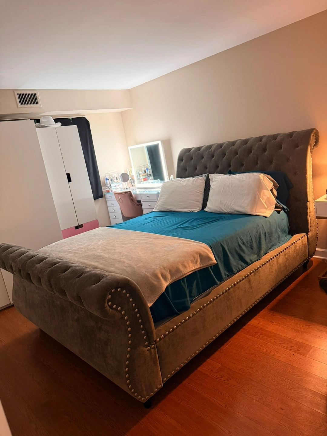Queen size tufted and studded upholstered bed frame.