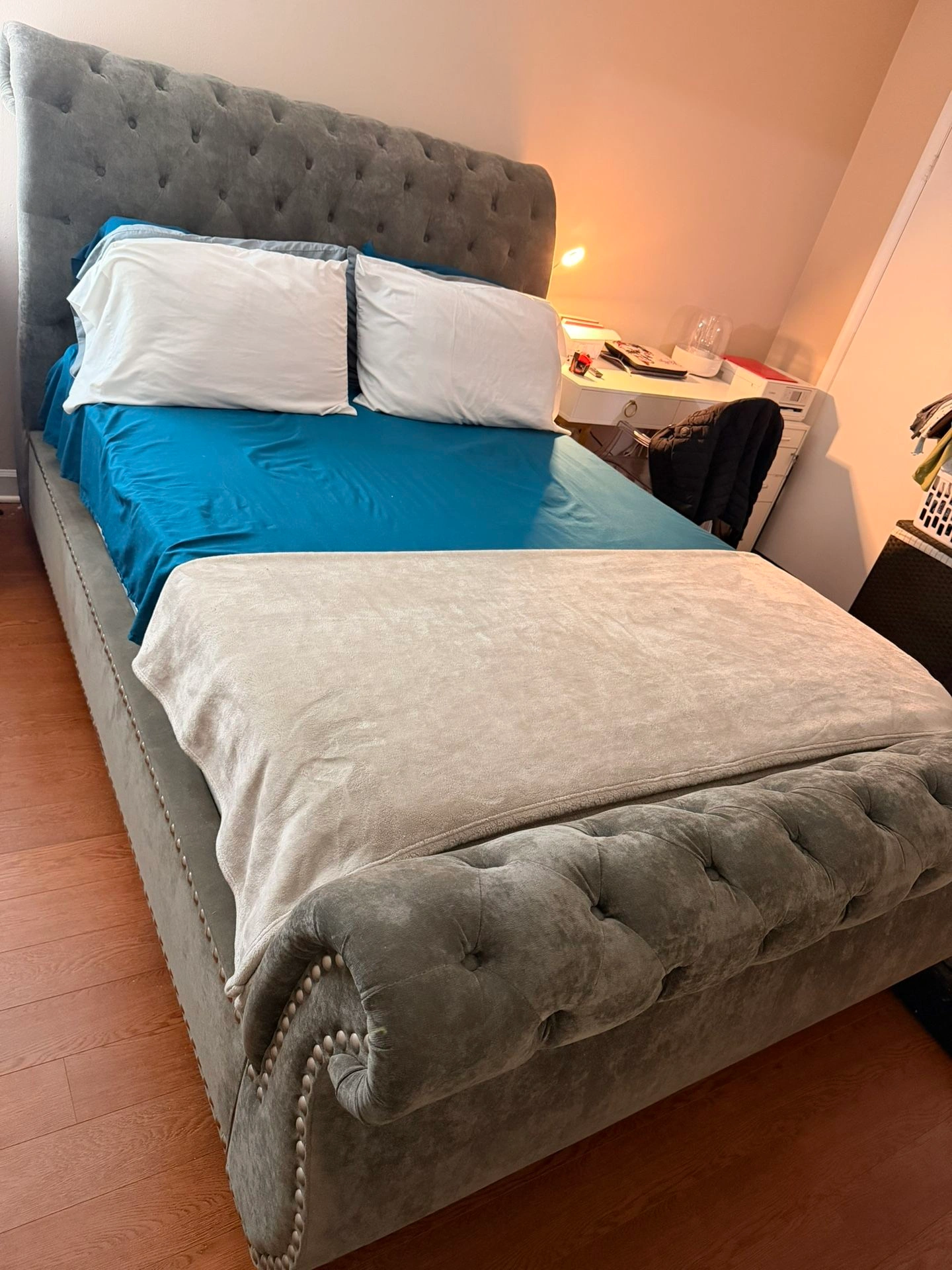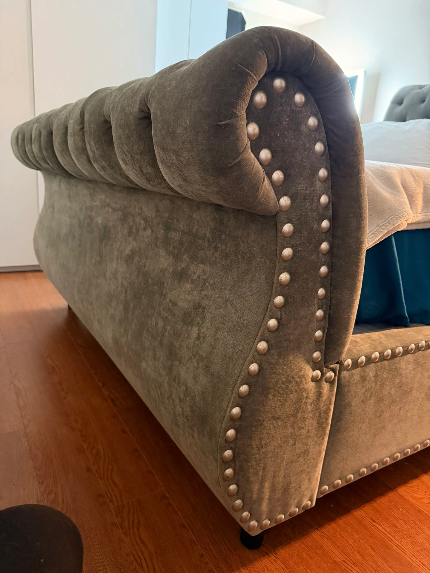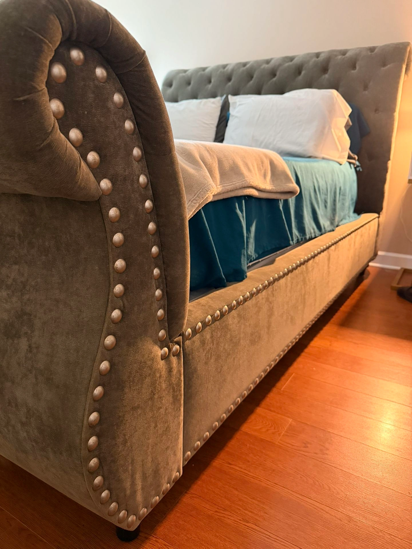 Queen size tufted and studded upholstered bed frame.