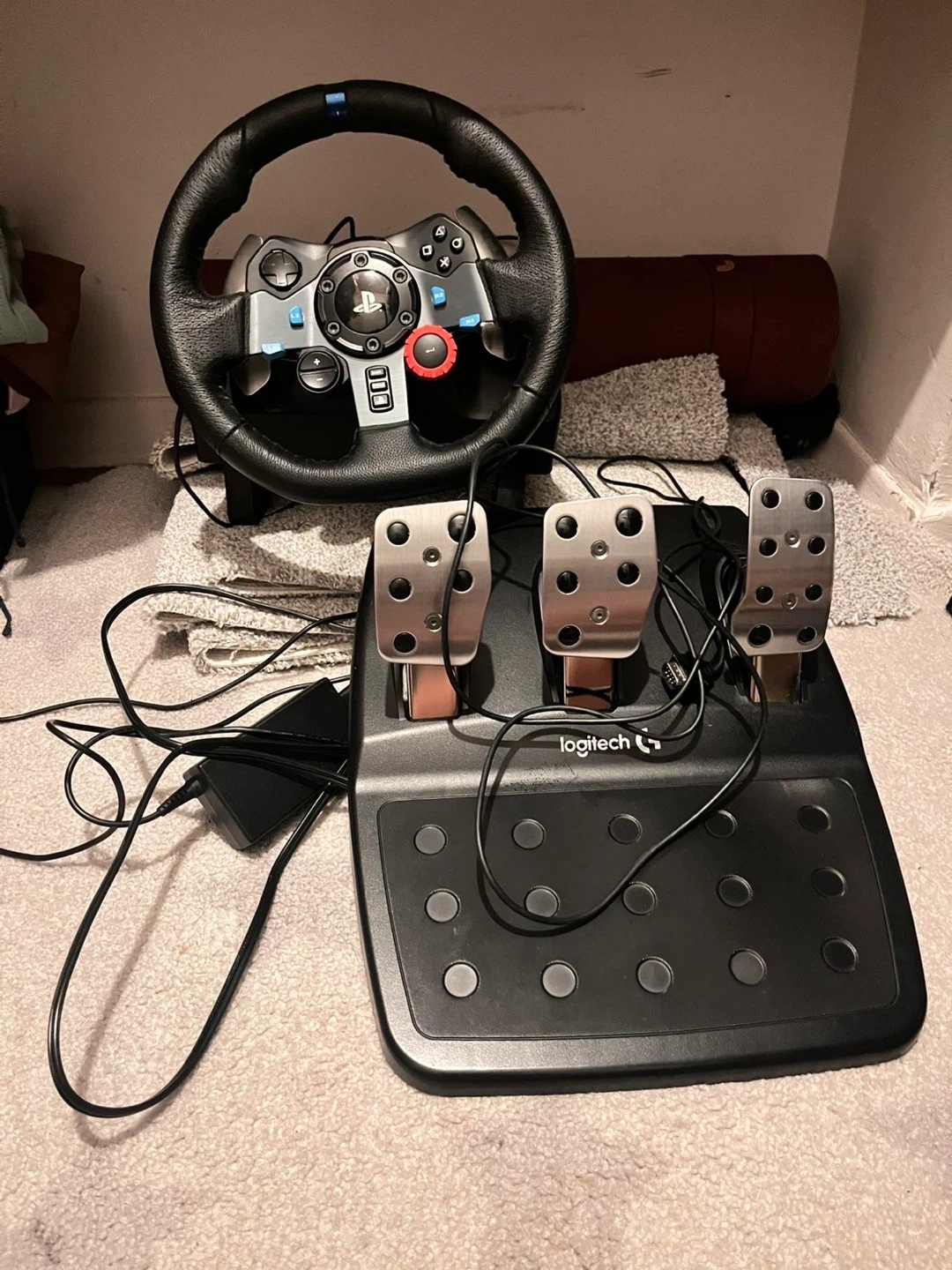Selling a Logitech G29 racing wheel and pedal set. It's in good condition and ready for a new gamer! Perfect for PlayStation and PC gaming. Included is the wheel, pedals, and all necessary cables.