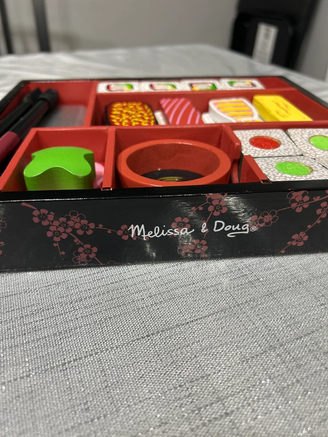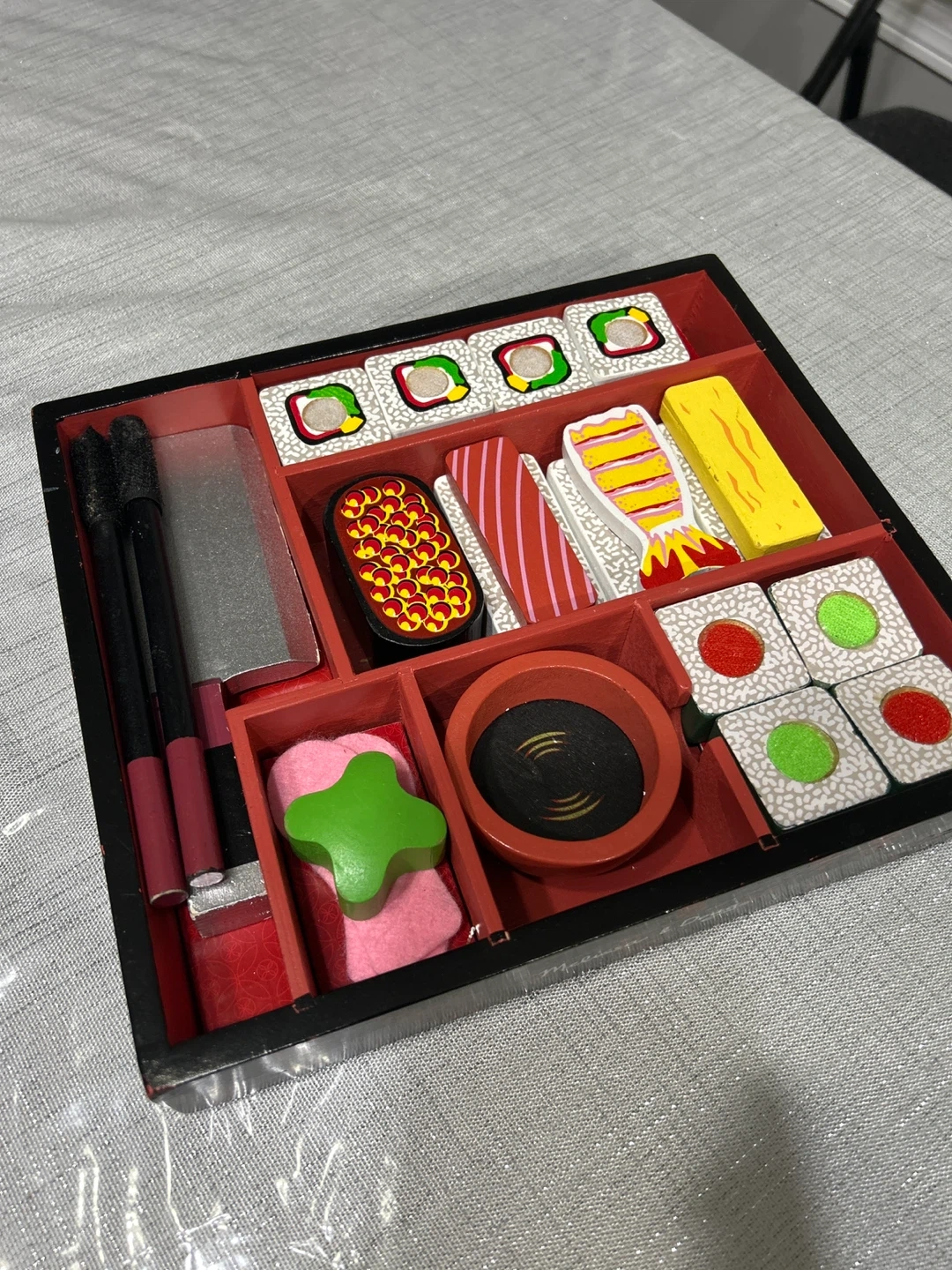 Selling a Melissa & Doug wooden sushi set! It's a fun and engaging toy for kids to explore sushi and develop fine motor skills. The set includes various sushi pieces, a serving tray, chopsticks, and a sauce dish. Perfect for creative play and learning!