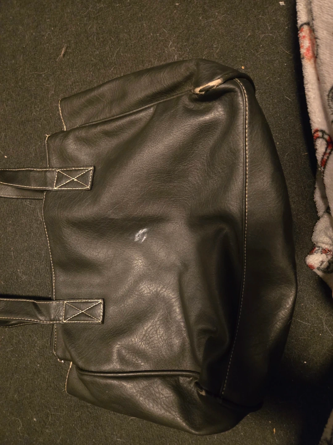 This AF tote bag has a black faux leather exterior with a tan accent panel. It's lined with patterned fabric and features an interior zippered pocket. A great everyday purse! Slightly damaged