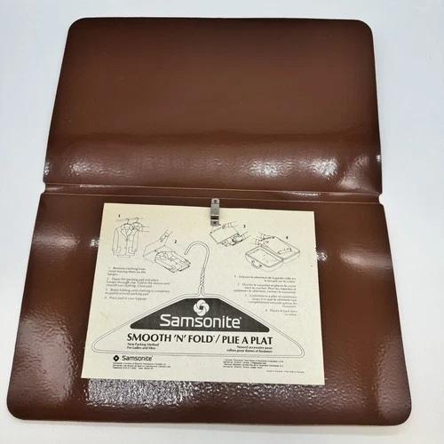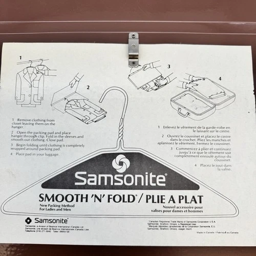 Vintage Samsonite Smooth ’N’ Fold / Plie à Plat packing pad, made in Canada and designed for neatly folding and packing suits, shirts, and clothing inside Samsonite luggage. This accessory dates from the late 1970s to early 1980s and still includes the original instruction sheet and functioning metal garment clip.