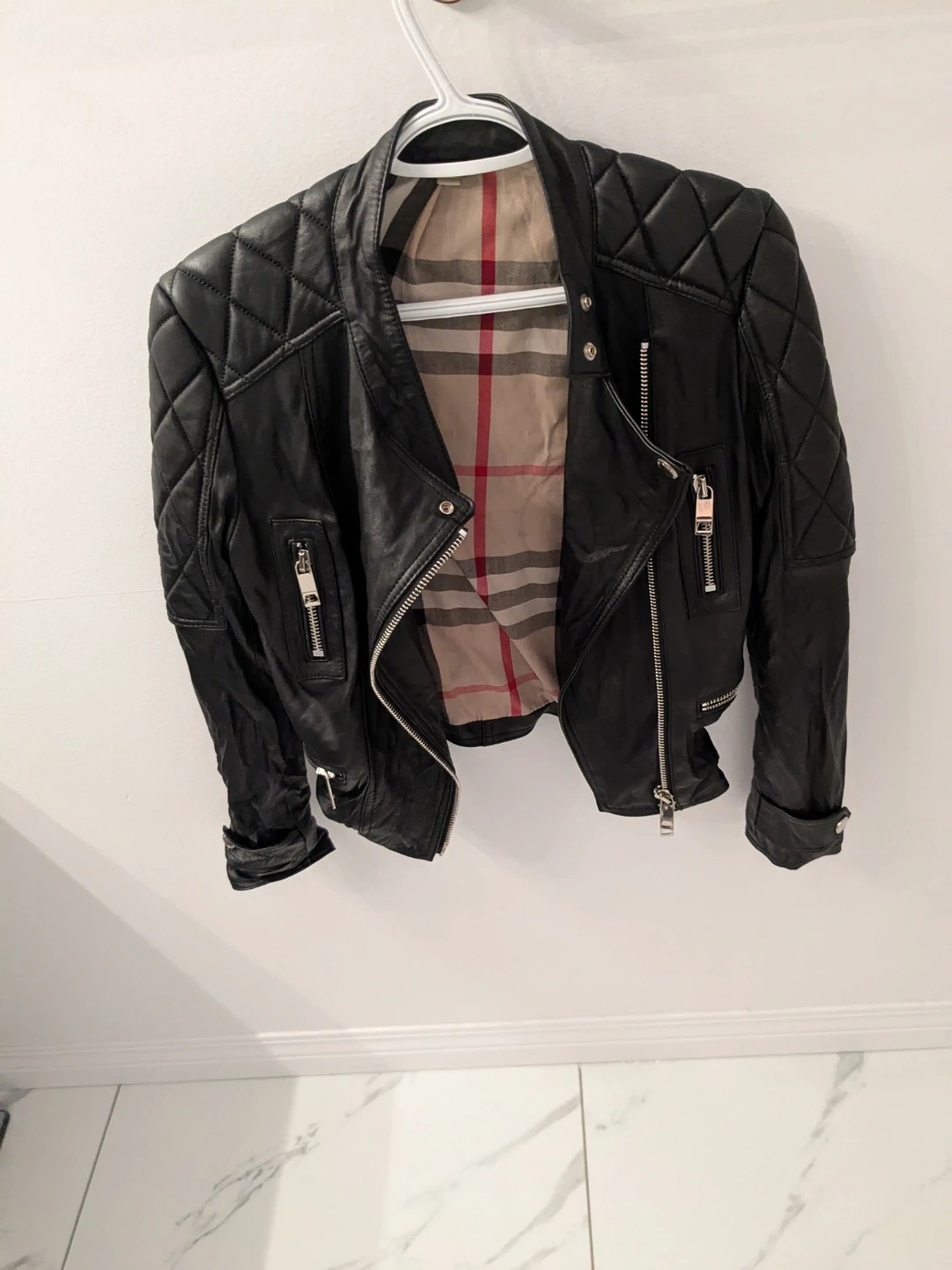 Burberry authentic black leather biker jacket with signature Nova Check lining. Lambskin shell and cotton/viscose blend lining. Includes zip pockets and buckle details.