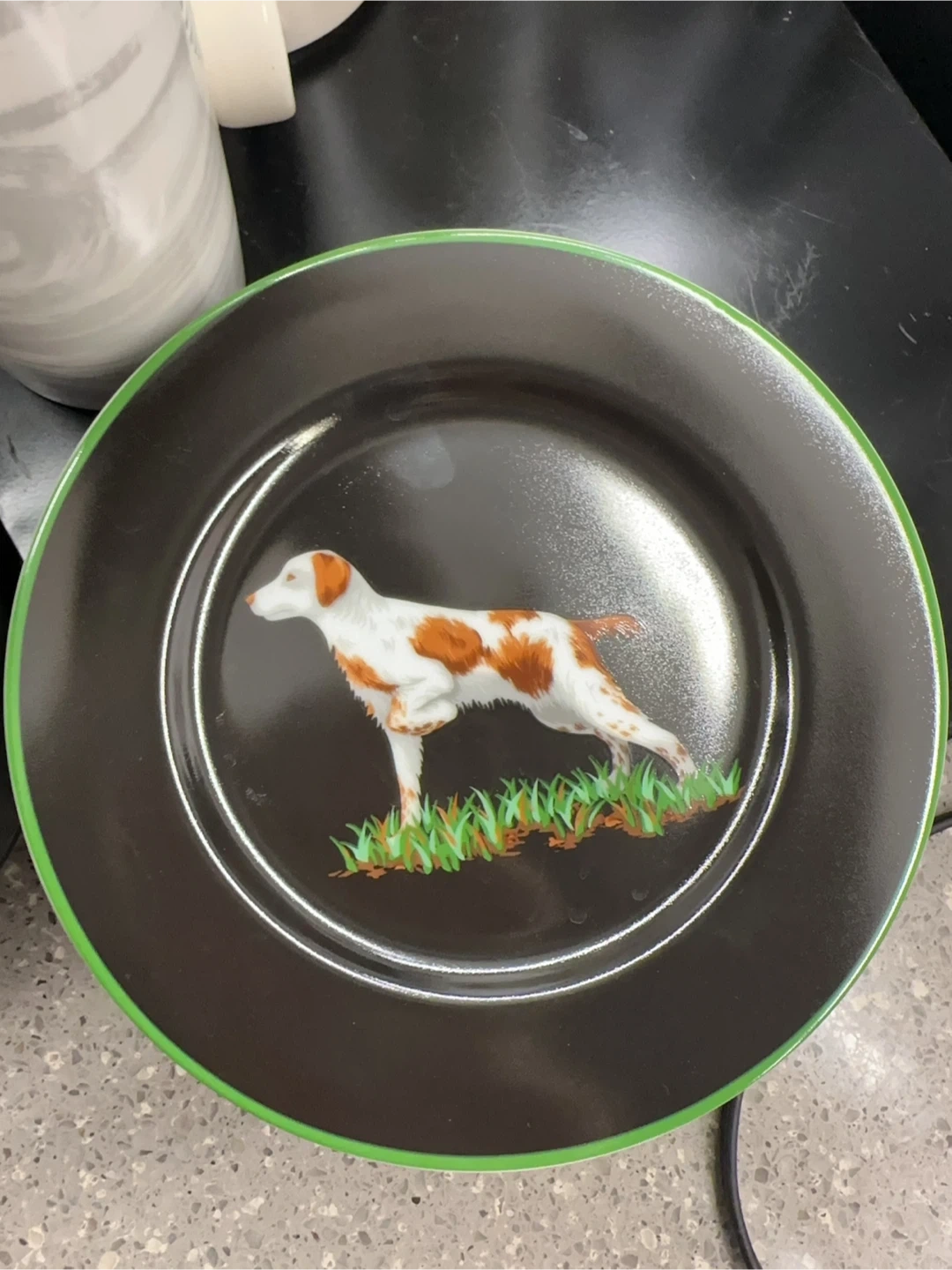 This set of four, decorative, porcelain plates were designed exclusively by Tiffany & Co. in 1992, as a set entitled “Hunting Dogs.” Each plate is 7 3/4″ in diameter, and it is a high gloss black with a bright kelly green rim. A Springer Spaniel, a German Short-Haired Pointer, an English Setter, and a Brittany Spaniel are each represented. Each dog is beautifully and artistically detailed, and each dog is done in a similar color palette. Two of the dogs face to the right and two face to the left. All these things combined make this set of porcelain plates perfect to be displayed together. The set is in mint condition.