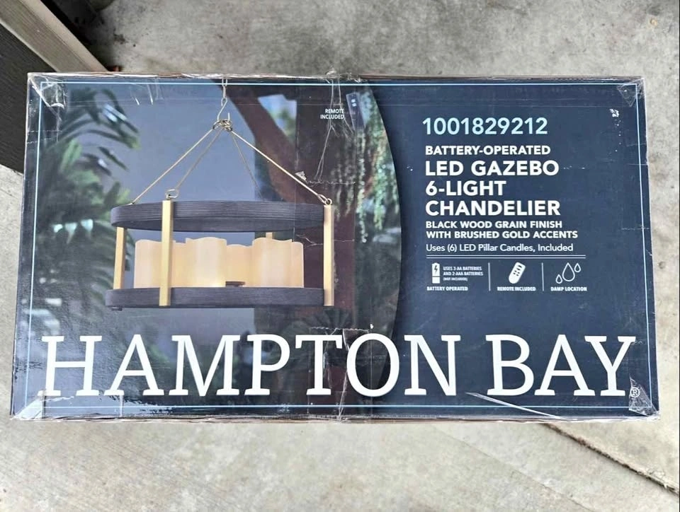 Hampton Bay Bolton 6-Light Steel LED Outdoor Gazebo Decorative Chandelier in Wood Brown Grain Finish Battery Powered. Retails for $130+.