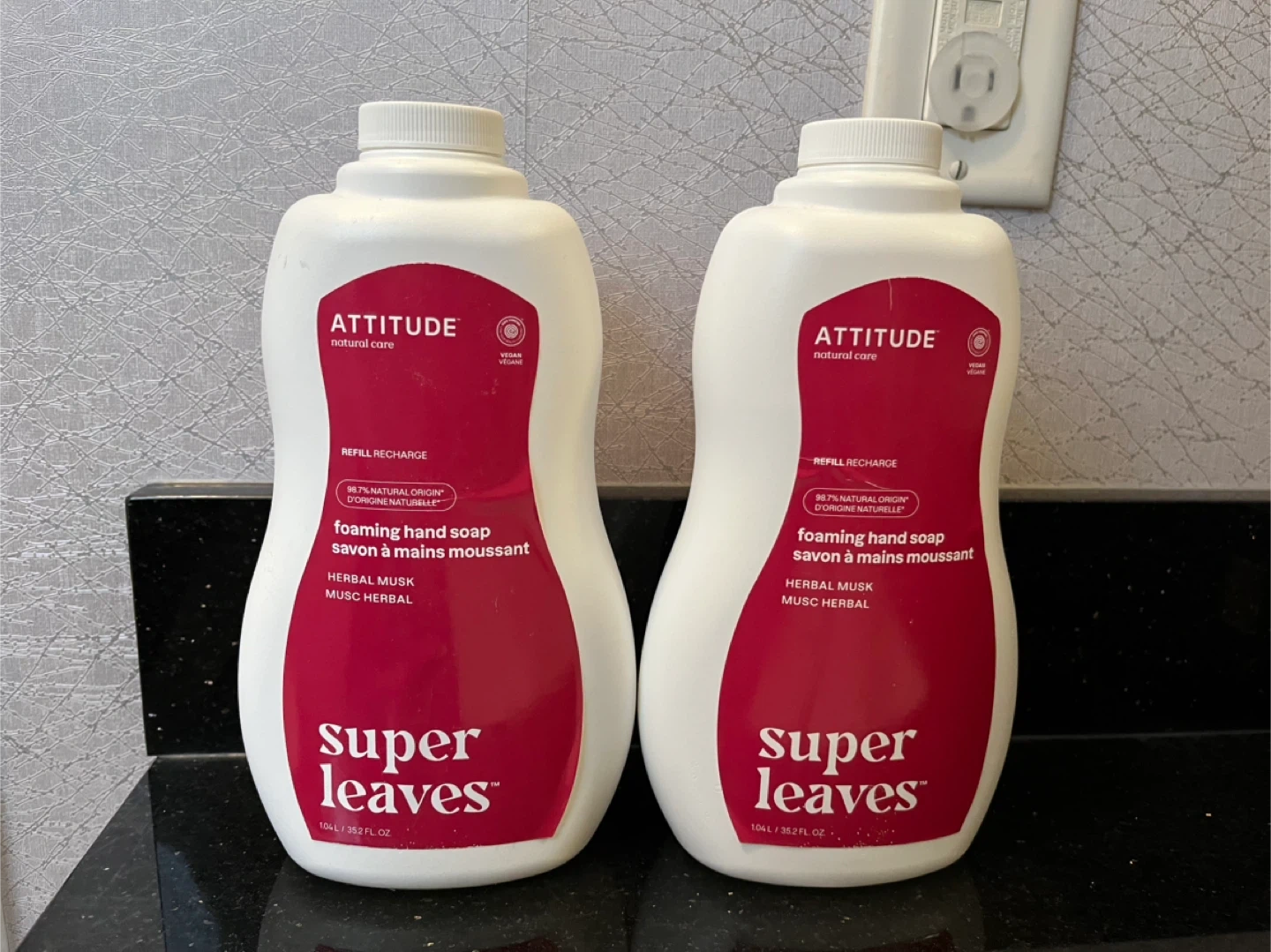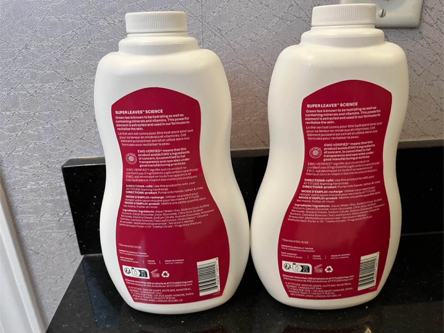 Two bottles of ATTITUDE foaming hand soap refill in Herbal Musk scent. Each bottle contains 1000ml (33.8 fl oz). One is sealed, one was opened but not used (bought the wrong kind, didn’t realize it was foaming). Made with 98.7% natural origin ingredients. EWG VERIFIED for transparency and eco-friendly practices.