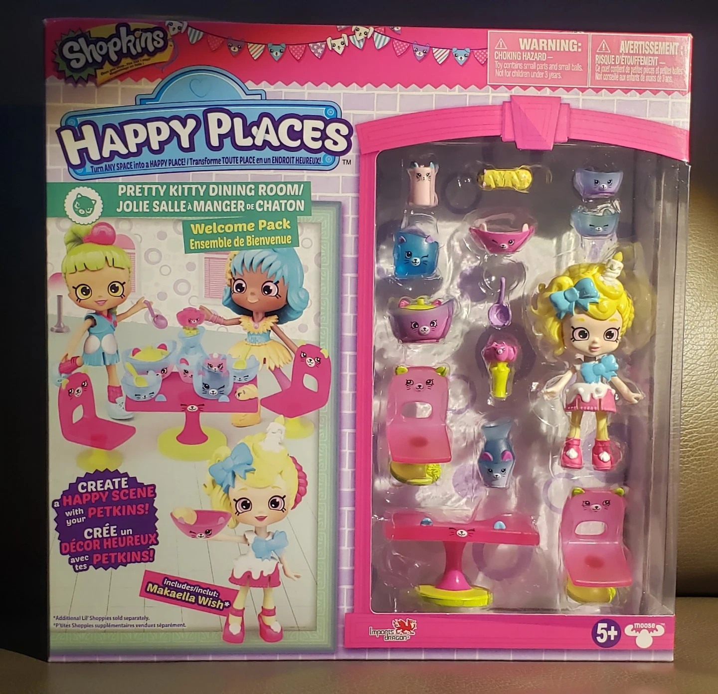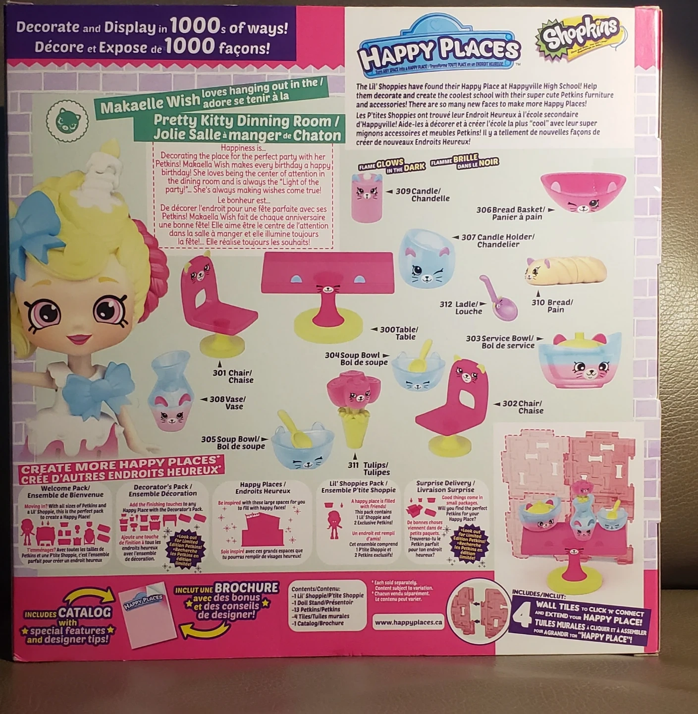 Shopkins Happy Places Pretty Kitty Dining Room Welcome Pack! Includes a catalogue with special features and designer tips. This set contains Lil' Shoppies doll, doll stand/Petkin display, 4 Petkins, and tiles/tiles murals and a catalog/brochure. Recommended for ages 5+