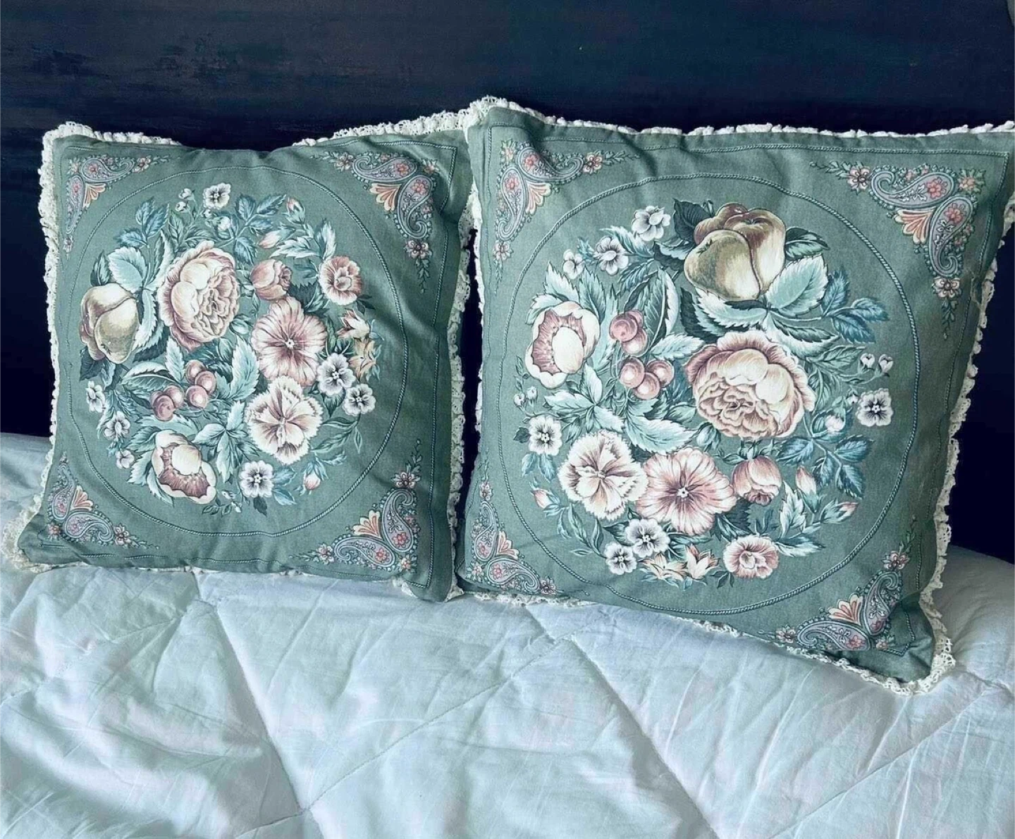 Two BRAND NEW 15” throw pillows featuring a lovely floral pattern with roses and intricate borders. They have a delicate lace trim around the edges. Perfect for adding a touch of vintage charm to your living room or bedroom!