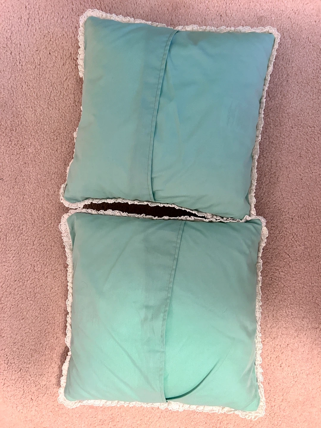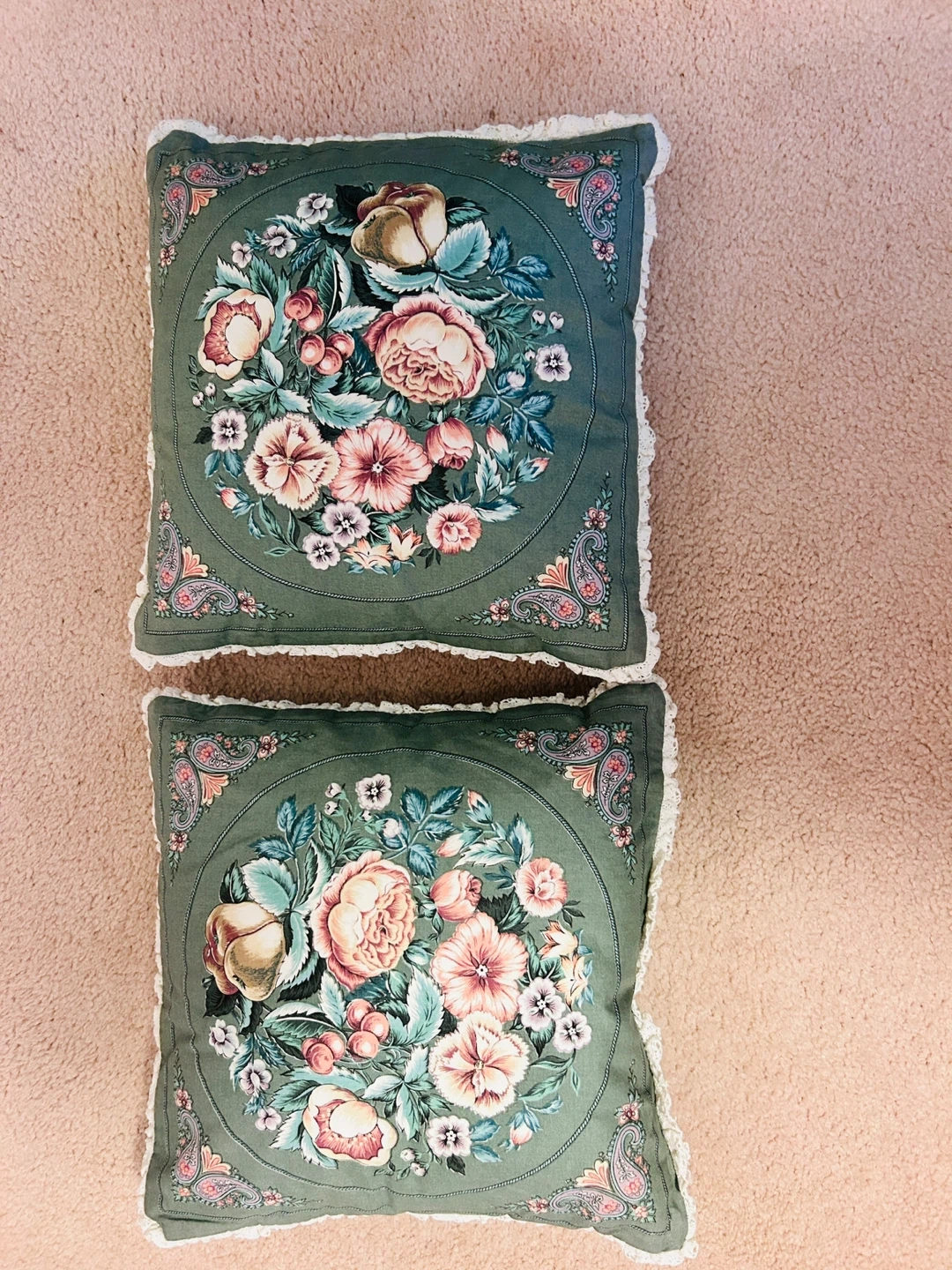 Two BRAND NEW 15” throw pillows featuring a lovely floral pattern with roses and intricate borders. They have a delicate lace trim around the edges. Perfect for adding a touch of vintage charm to your living room or bedroom!