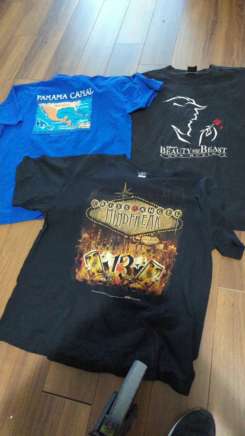Three graphic t-shirts included: one blue Panama Canal shirt, one black Criss Angel Mindfreak shirt, and one black Disney's Beauty and the Beast New Musical shirt. musicals!