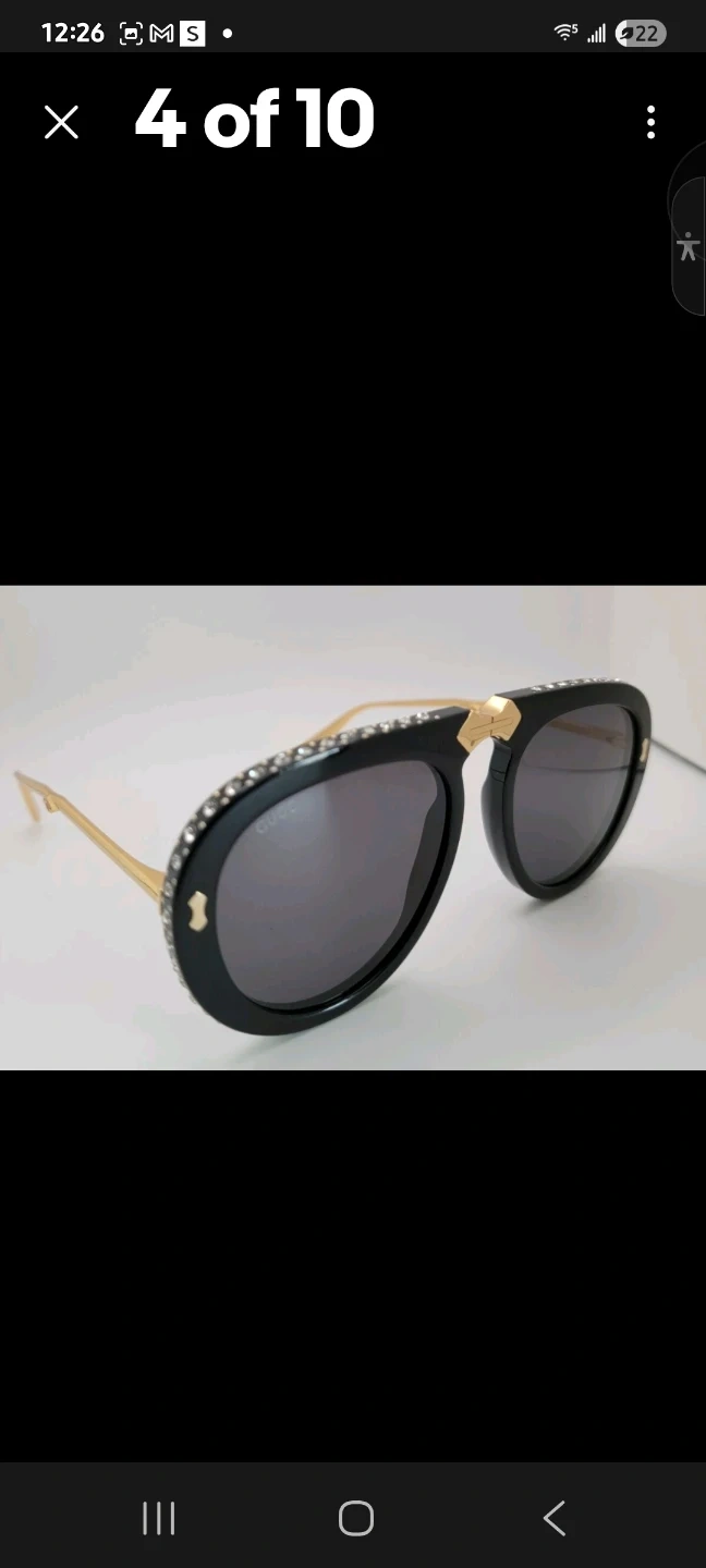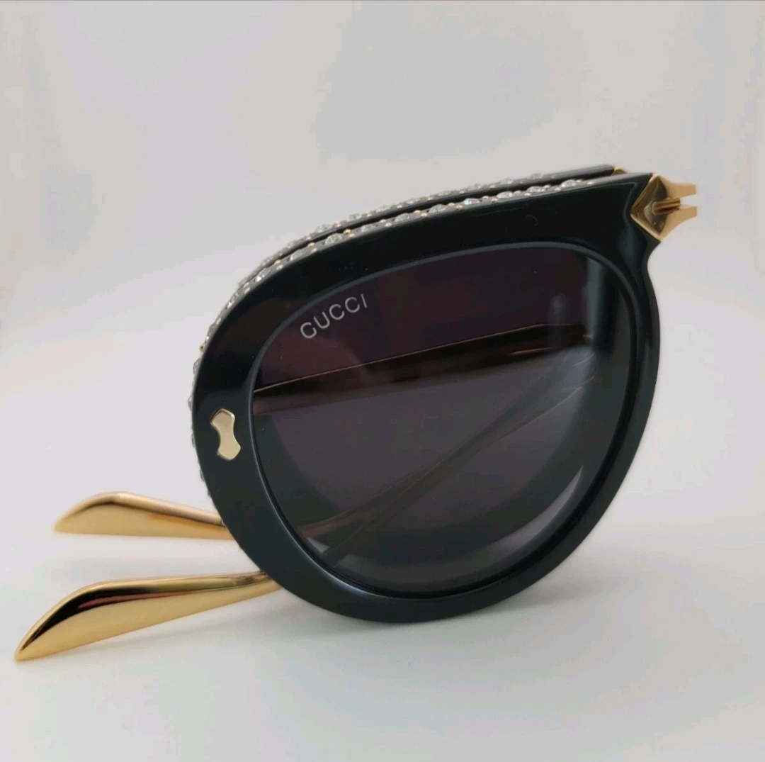 Gucci aviator sunglasses in black with gold accents. Features crystal embellishments on the frame. Includes original case and cleaning cloth. These sunglasses add a touch of luxury to any outfit!