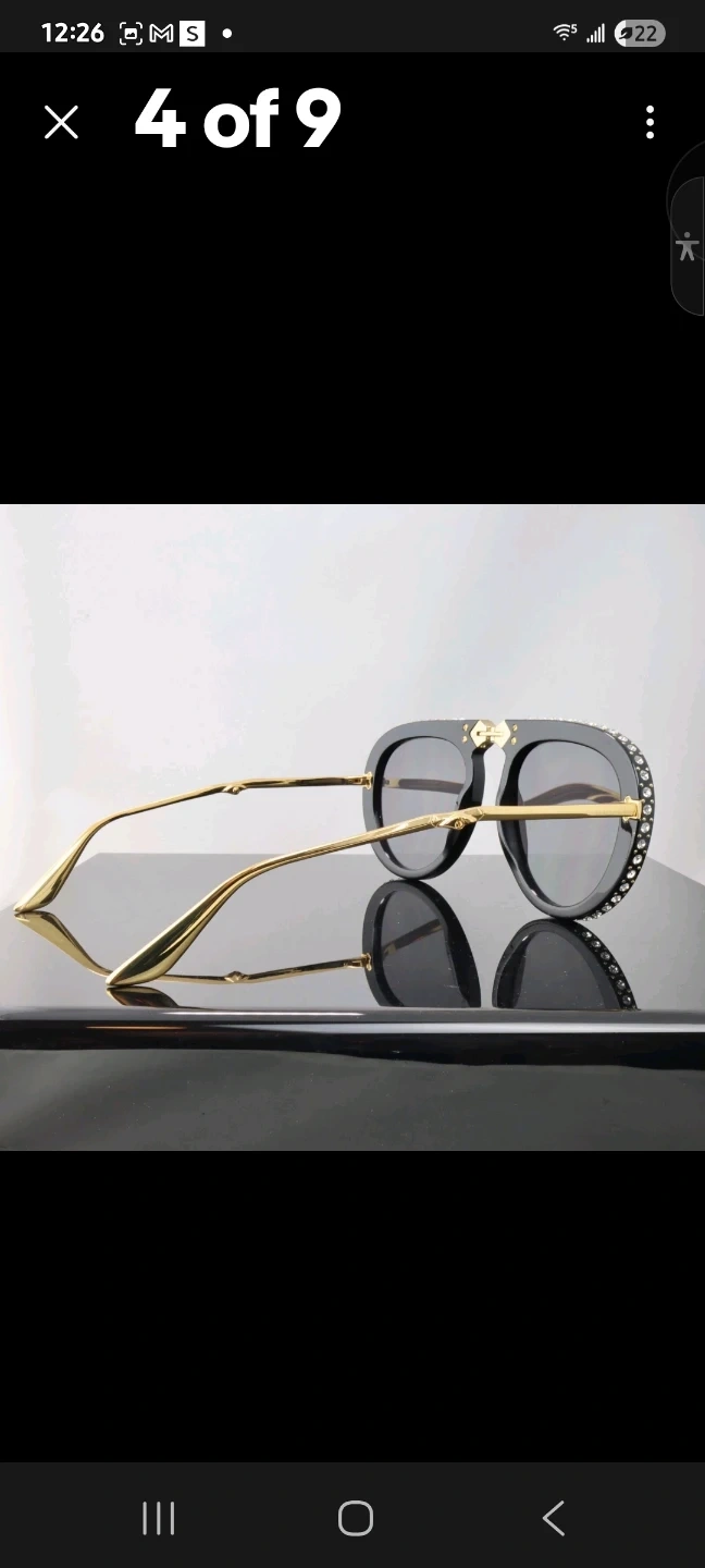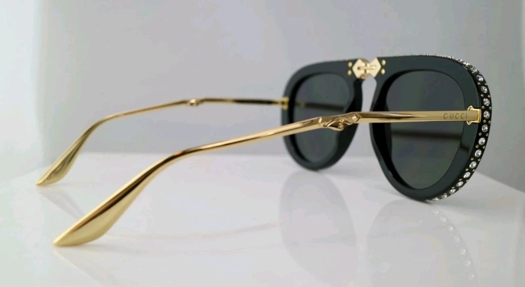 Gucci aviator sunglasses in black with gold accents. Features crystal embellishments on the frame. Includes original case and cleaning cloth. These sunglasses add a touch of luxury to any outfit!