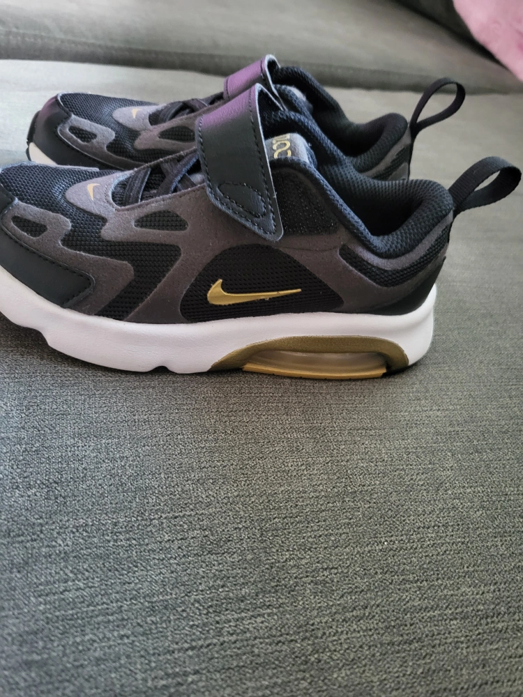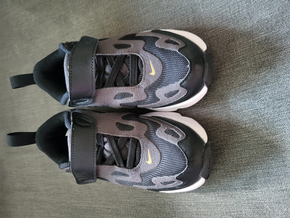 Selling a pair of Nike Air Max 200 toddler shoes in size US 10C. They're in great shape and ready for a new home! The shoes feature a stylish black and grey design with a gold Nike swoosh. Only worn once
