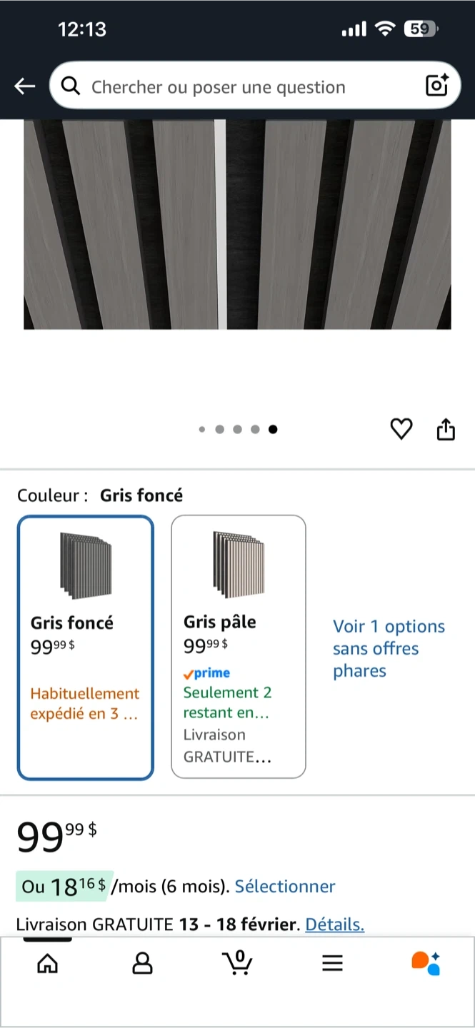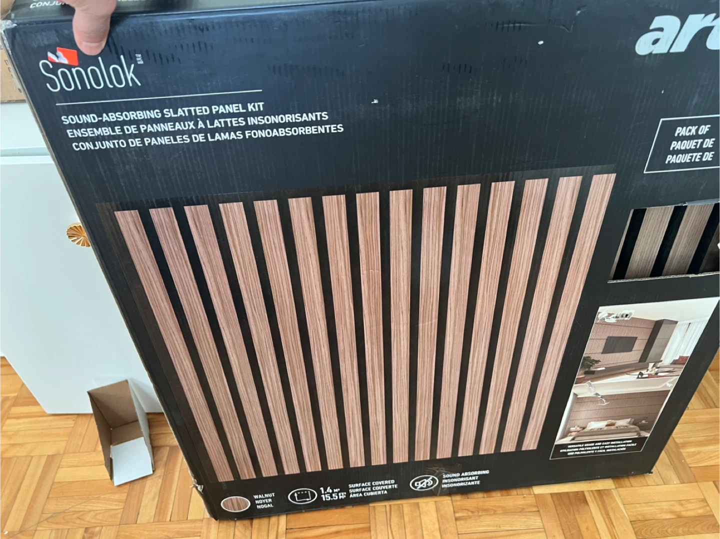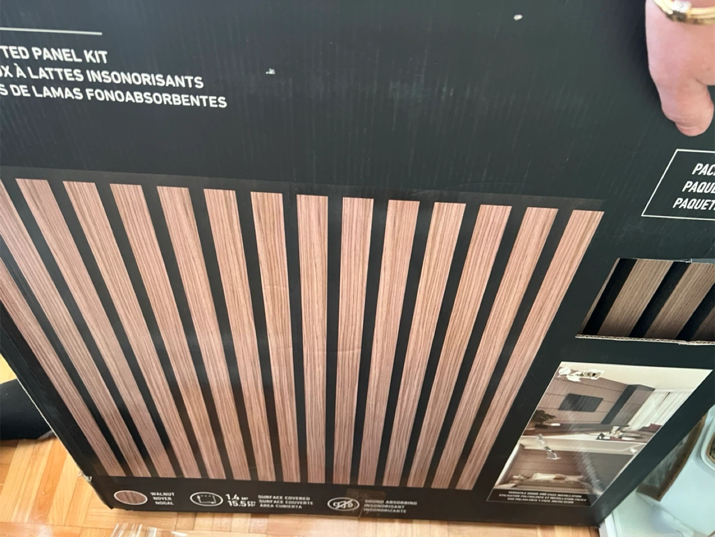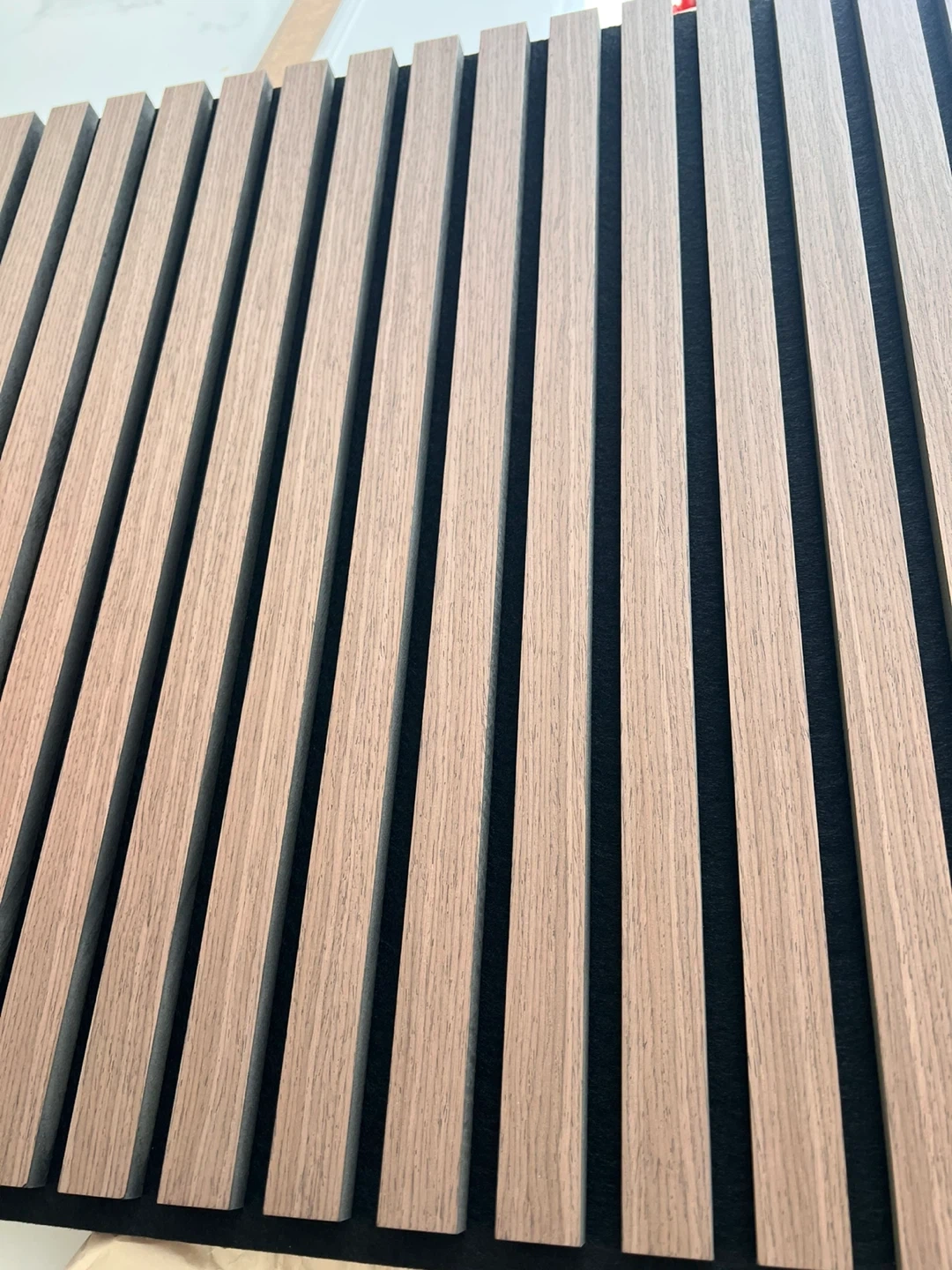 Ensemble de panneaux muraux insonorisants de marque Sonolok. Couleur gris foncé avec lattes en bois. Idéal pour améliorer l'acoustique d'une pièce. Surface couverte de 1.4 m².