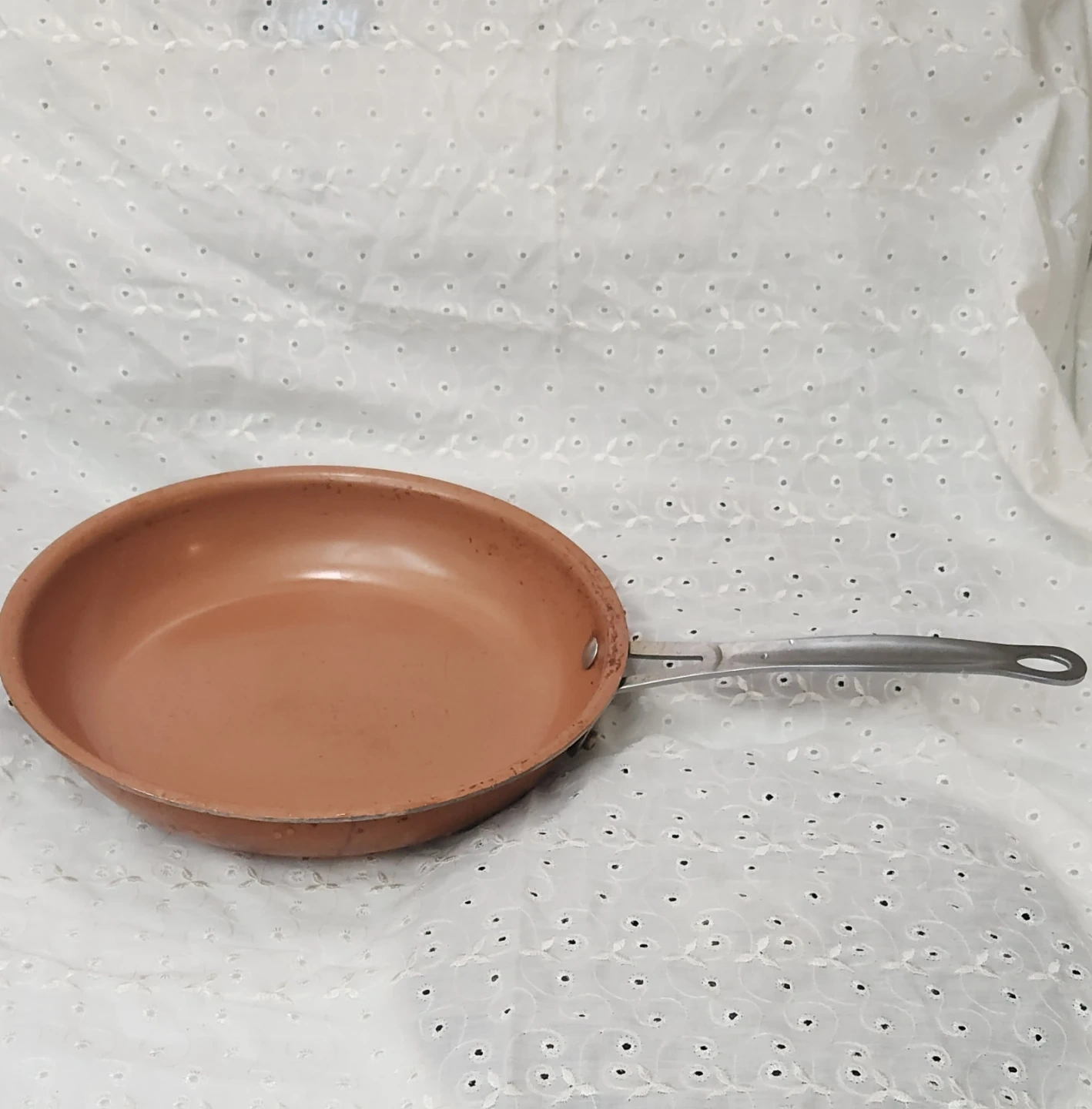 Copper-coloured frying pan with a non-stick interior. It has a metal handle for a secure grip. This pan's surface shows some wear, but it's still functional for everyday cooking.