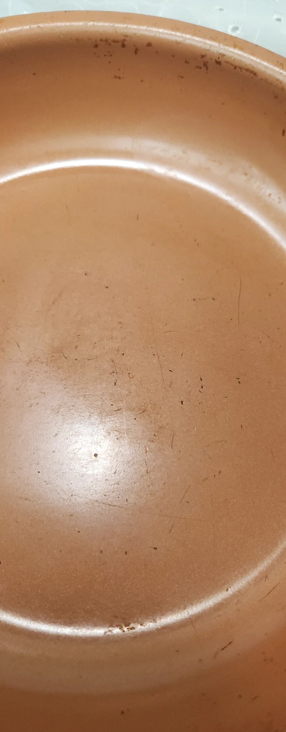 Copper-coloured frying pan with a non-stick interior. It has a metal handle for a secure grip. This pan's surface shows some wear, but it's still functional for everyday cooking.