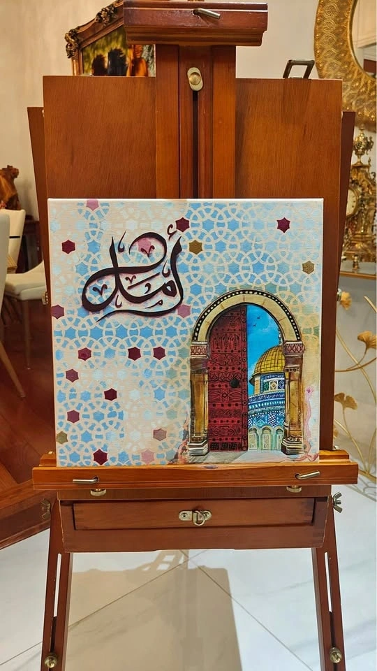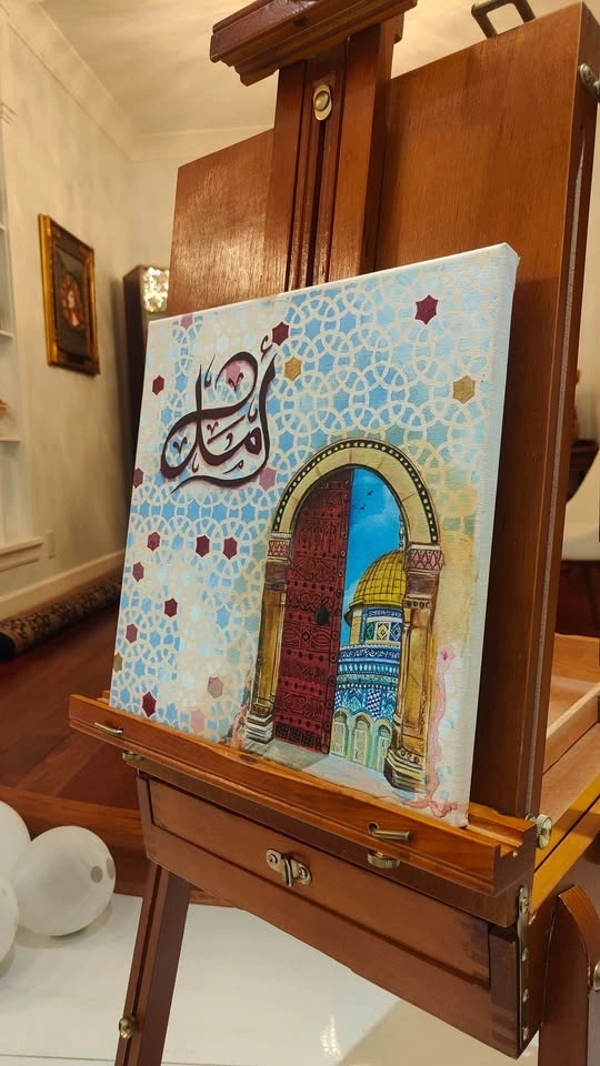 أمل (hope) is the light that endures every dark tunnel, speaking for every soul yearning for justice and every heart seeking solace. Hand painted Collectors Art depicting a vintage portal into a land where the skies are free. A great meaningful addition to any space. Part of a larger collection by the Artist.