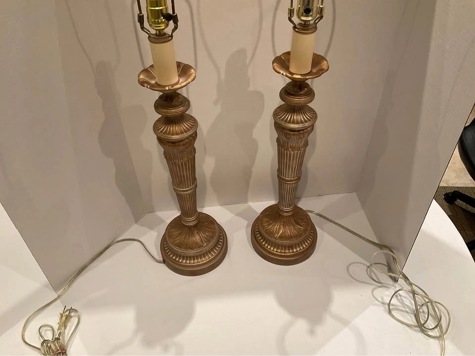Elegant pair of vintage Florentine gold tone table lamps. These have a nice ornate design on the base and stem. These lamps are sturdy, they are metal. Both lamps are working and ready for your favorite shades.