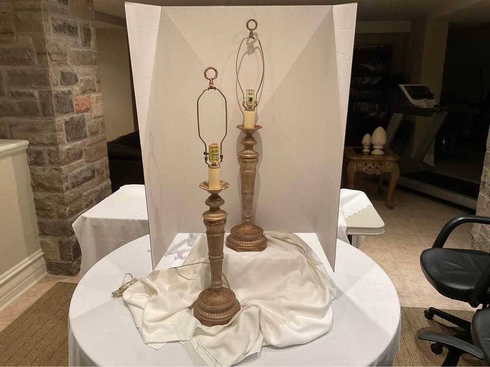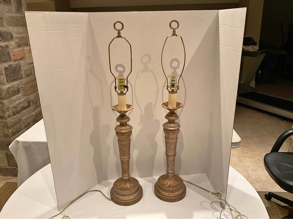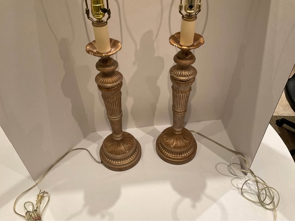 Elegant pair of vintage Florentine gold tone table lamps. These have a nice ornate design on the base and stem. These lamps are sturdy, they are metal. Both lamps are working and ready for your favorite shades.