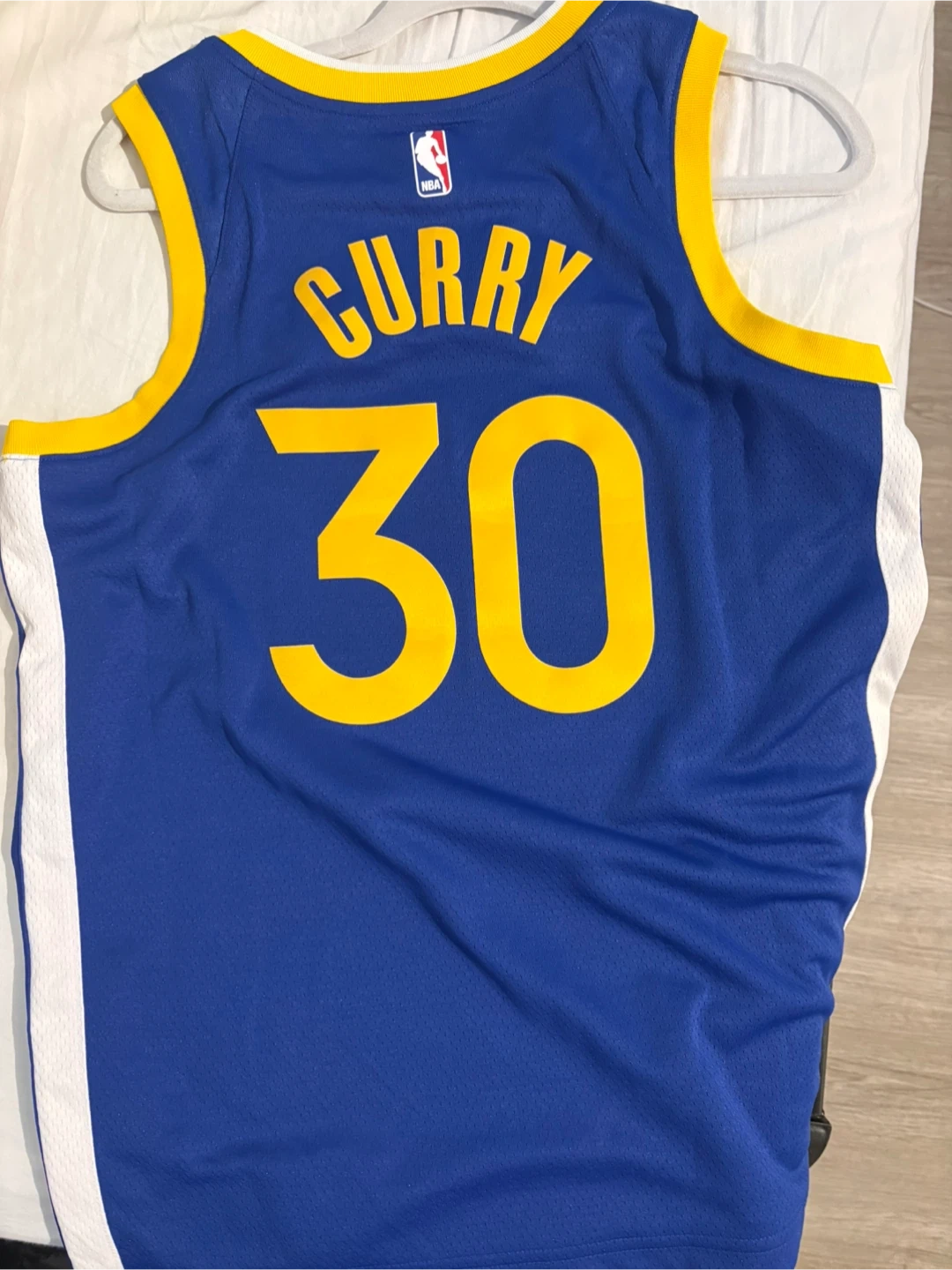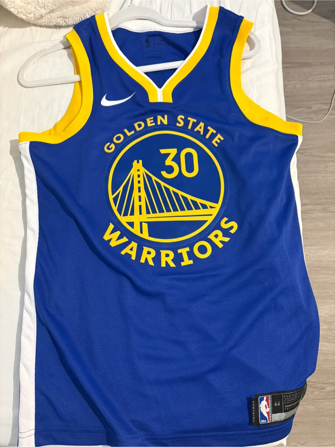 Stephen Curry Golden State Warriors jersey. Features team name and number 30 on the front, and Curry's name and number on the back. Size M