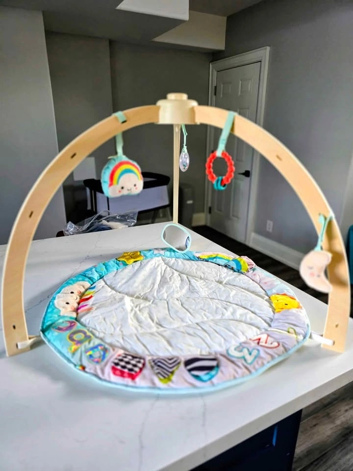 Gently used baby play gym with soft padded tummy time mat and wooden arch. Clean, complete, and in excellent condition. Includes: Soft quilted play mat, Wooden play arch, Hanging toys (mirror, rattle, sensory ring, plush toys). Bright colours and textures for early sensory play. Easy to assemble and store. From a smoke-free, pet-free home. Pickup near Meadowvale & Ellesmere.