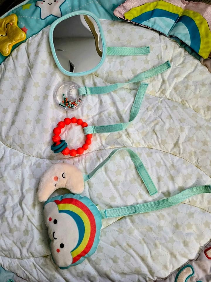 Gently used baby play gym with soft padded tummy time mat and wooden arch. Clean, complete, and in excellent condition. Includes: Soft quilted play mat, Wooden play arch, Hanging toys (mirror, rattle, sensory ring, plush toys). Bright colours and textures for early sensory play. Easy to assemble and store. From a smoke-free, pet-free home. Pickup near Meadowvale & Ellesmere.