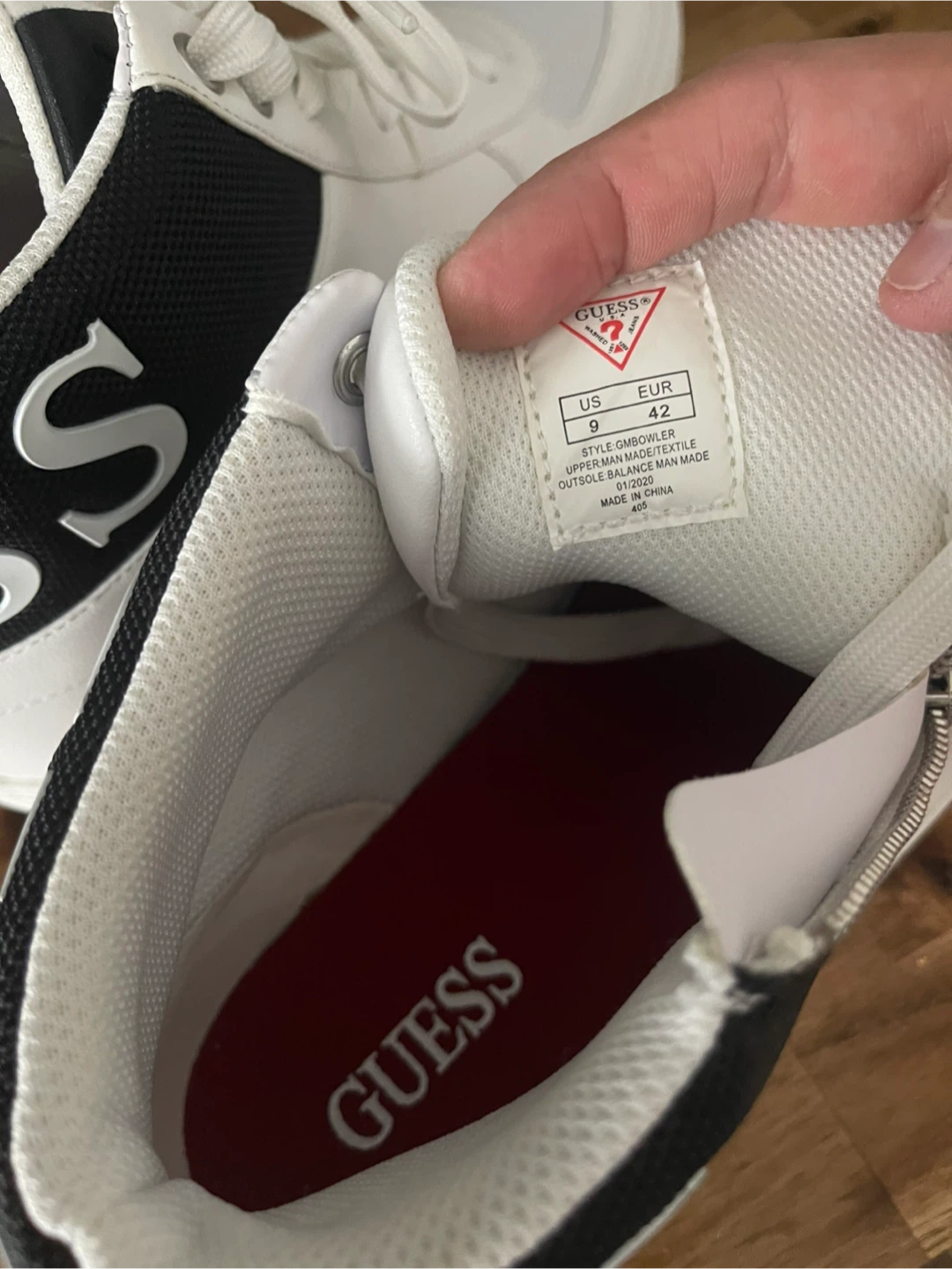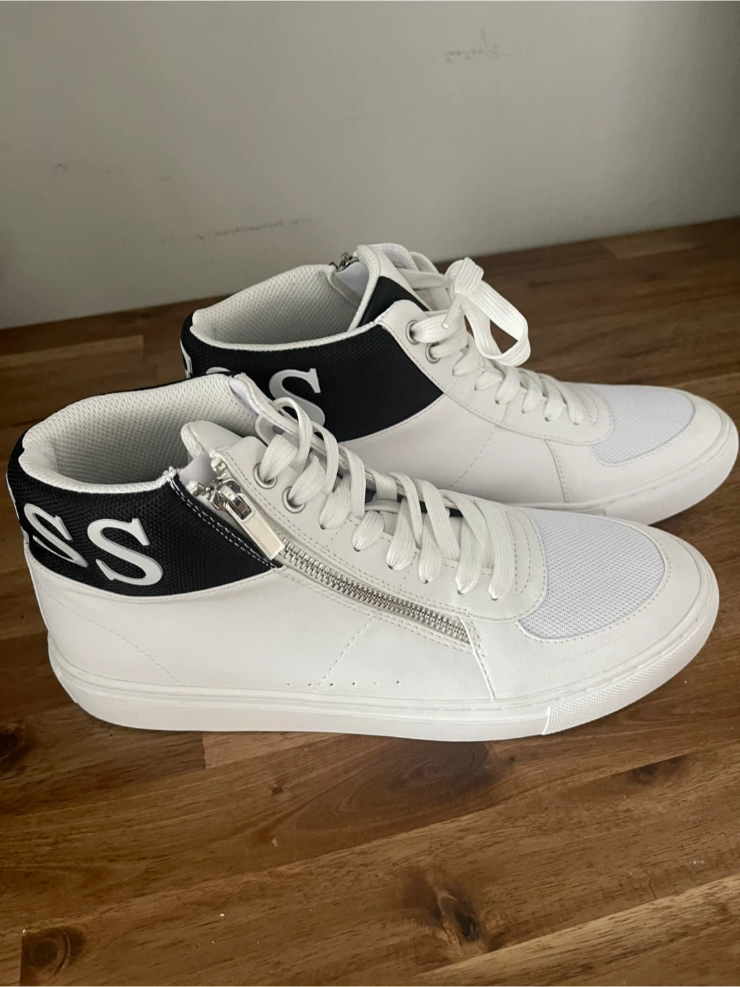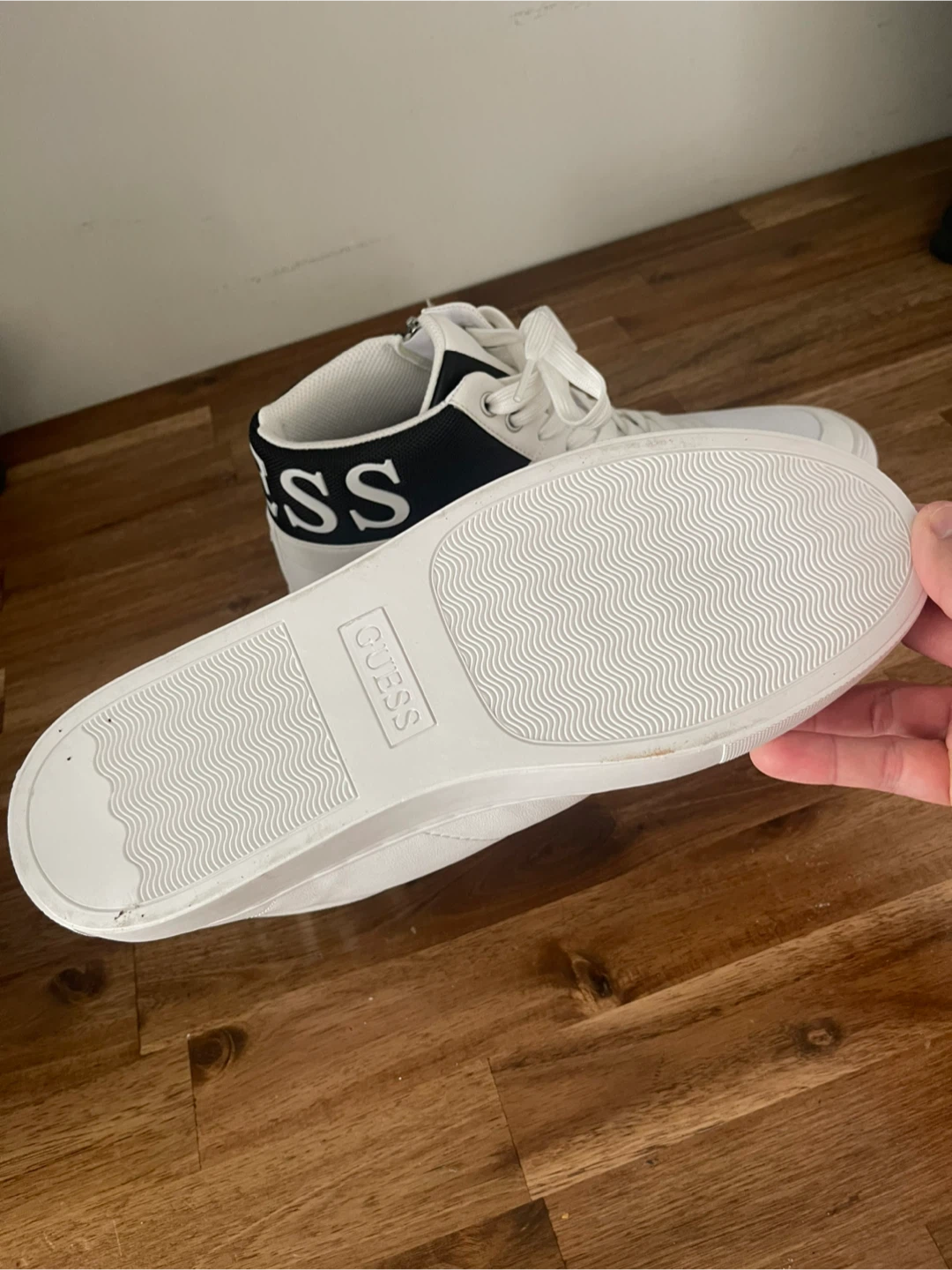 Selling a pair of Guess high-top sneakers in white. They feature a stylish black accent around the ankle and a convenient side zipper. The size is US 9 / EUR 42. Perfect for adding a bit of flair to your casual outfits!