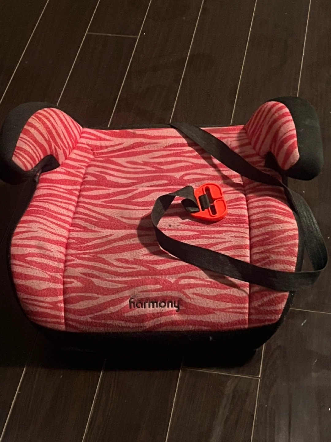 Harmony booster car seat in a fun pink zebra print. This car seat provides a comfortable and safe ride for your little one. It's designed for easy installation and use.