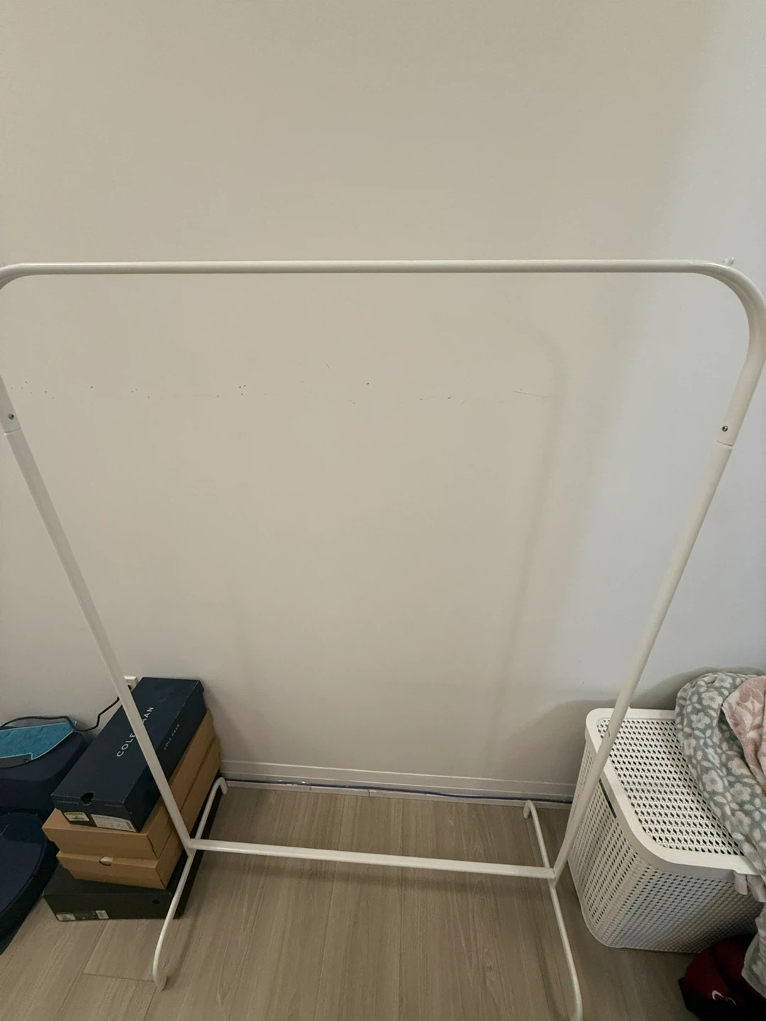 A simple white metal garment rack for hanging clothes. It's sturdy and ready for use. This rack is great for organizing your closet or for displaying outfits.
